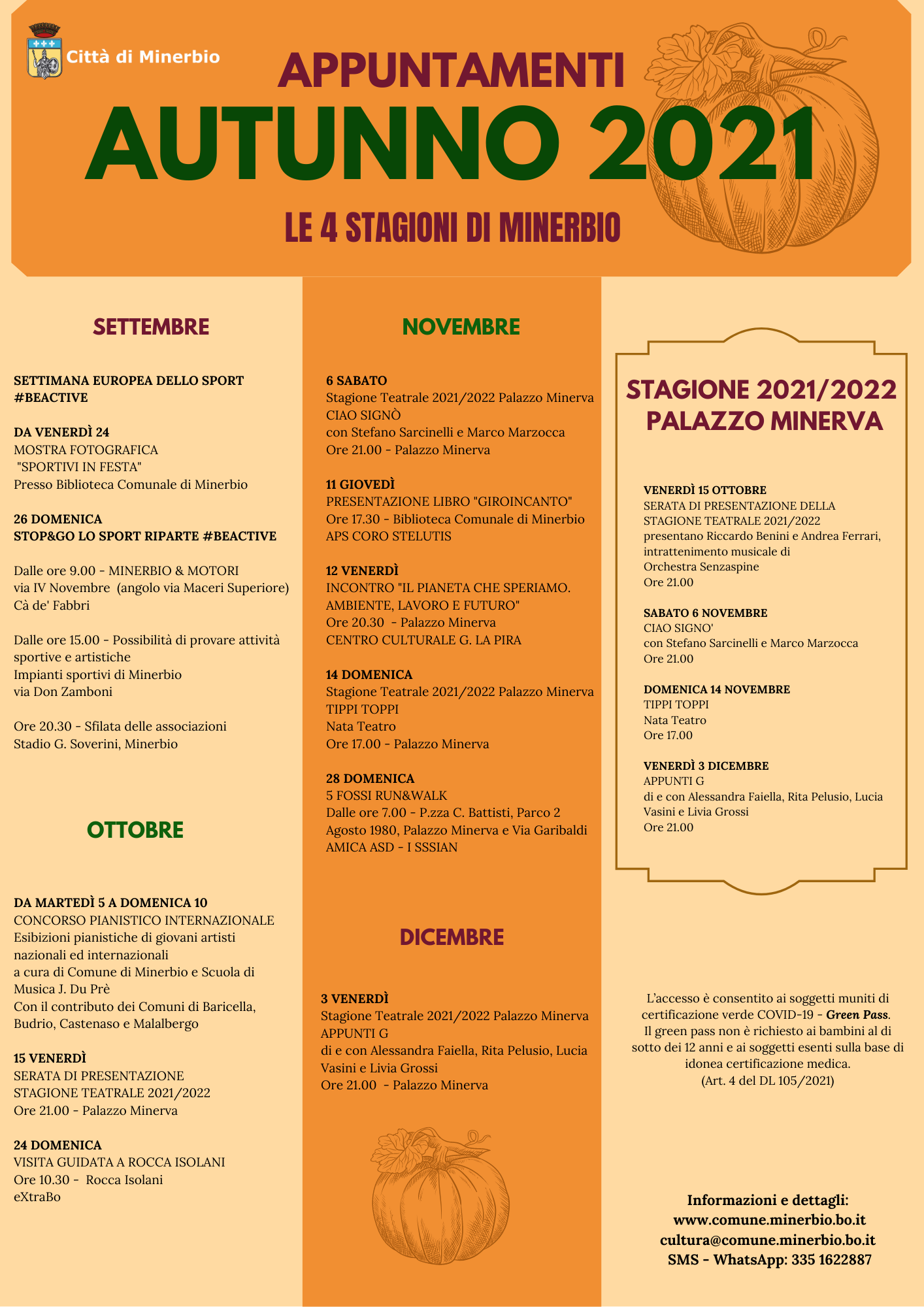 Il Sindaco "Apriamo la seconda stagione di Minerbio, quella autunnale, ricca di occasioni di incontro e di svago. Ci vedremo per condividere le nostre proposte di intrattenimento e di cultura e torneremo a vivere il nostro Teatro tra novità e tradizione.
