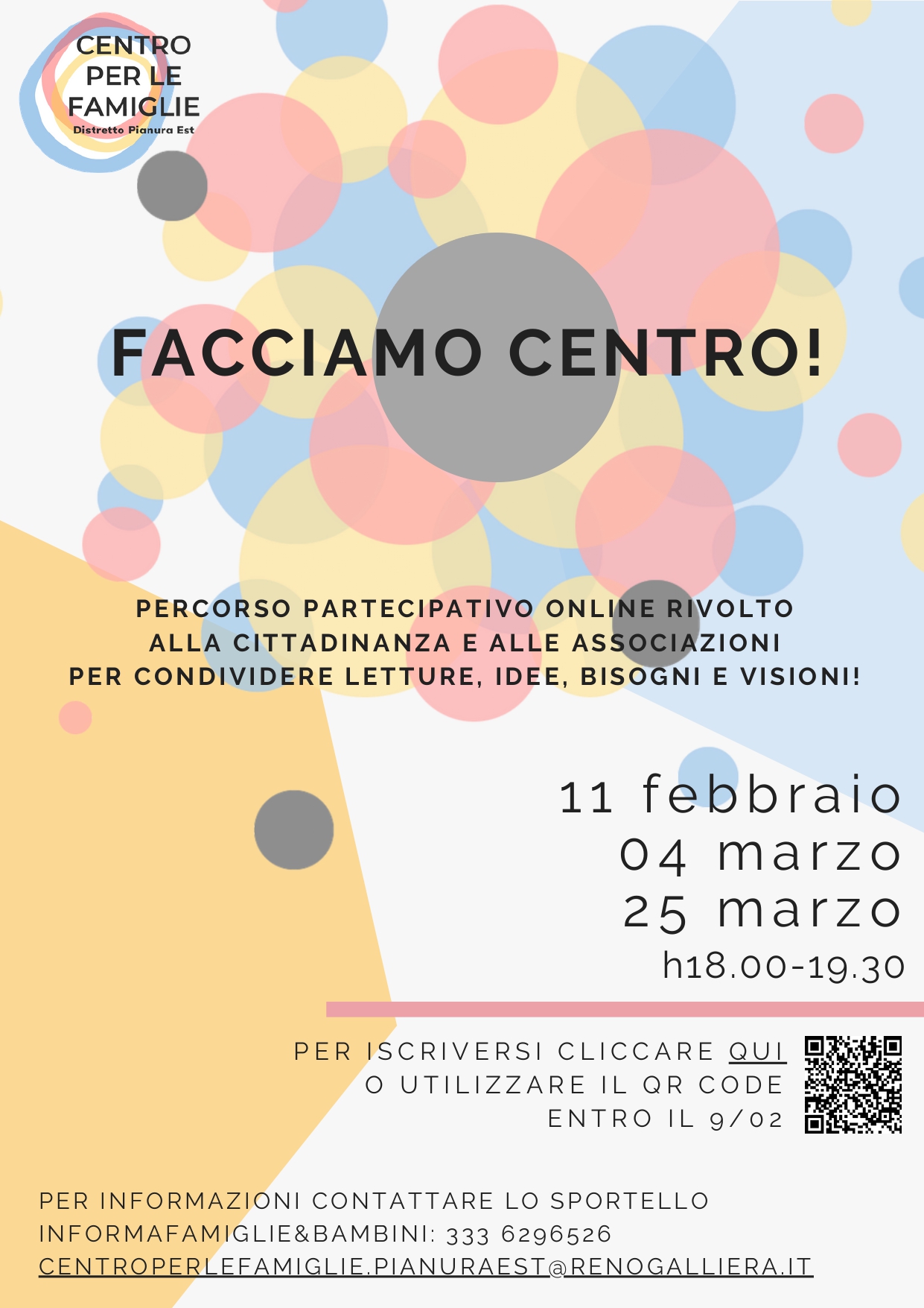 Per informazioni contattare lo sportello Informafamiglie&Bambini ai seguenti recapiti: 333 6296526, email centroperlefamiglie.pianuraest@renogalliera.it.