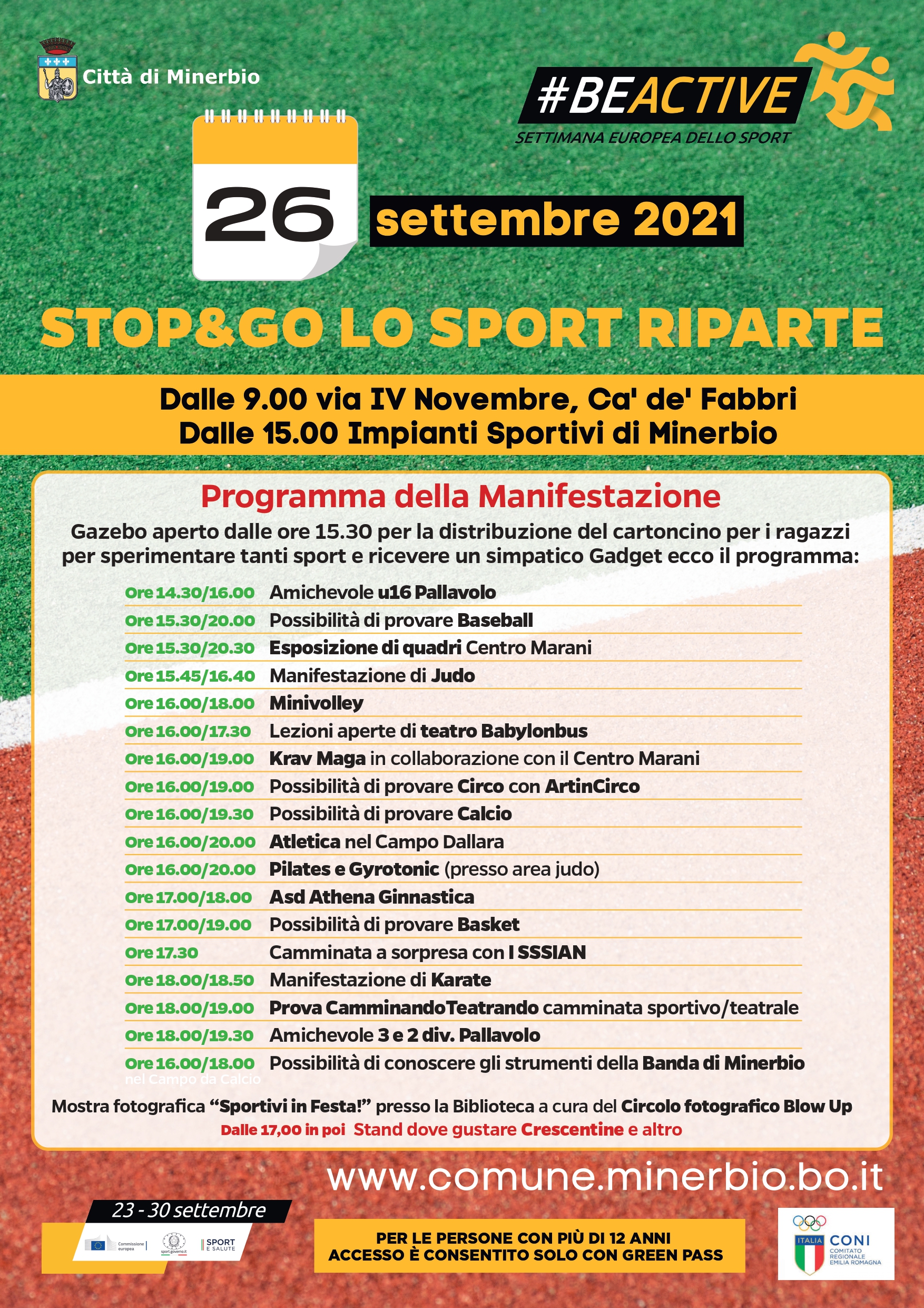 Domenica 26 settembre, in occasione della Settimana europea dello sport, si terrà a Minerbio l'evento "STOP&GO LO SPORT RIPARTE".
