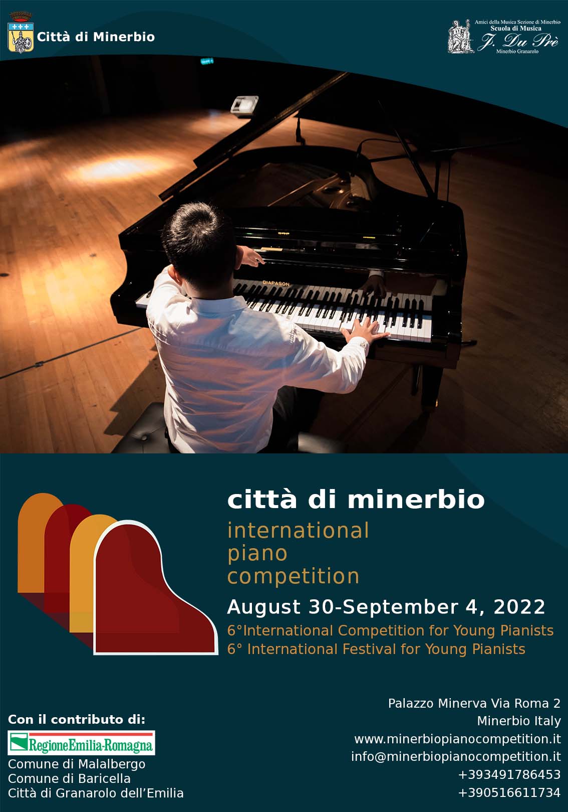 Dal 30 agosto al 4 settembre 2022 la Città di Minerbio ospiterà la sesta edizione del Concorso Pianistico internazionale "Città di Minerbio": un calendario ricco di concerti diffusi per il territorio minerbiese e nei comuni limitrofi di Baricella, Granarolo dell'Emilia e Malalbergo.