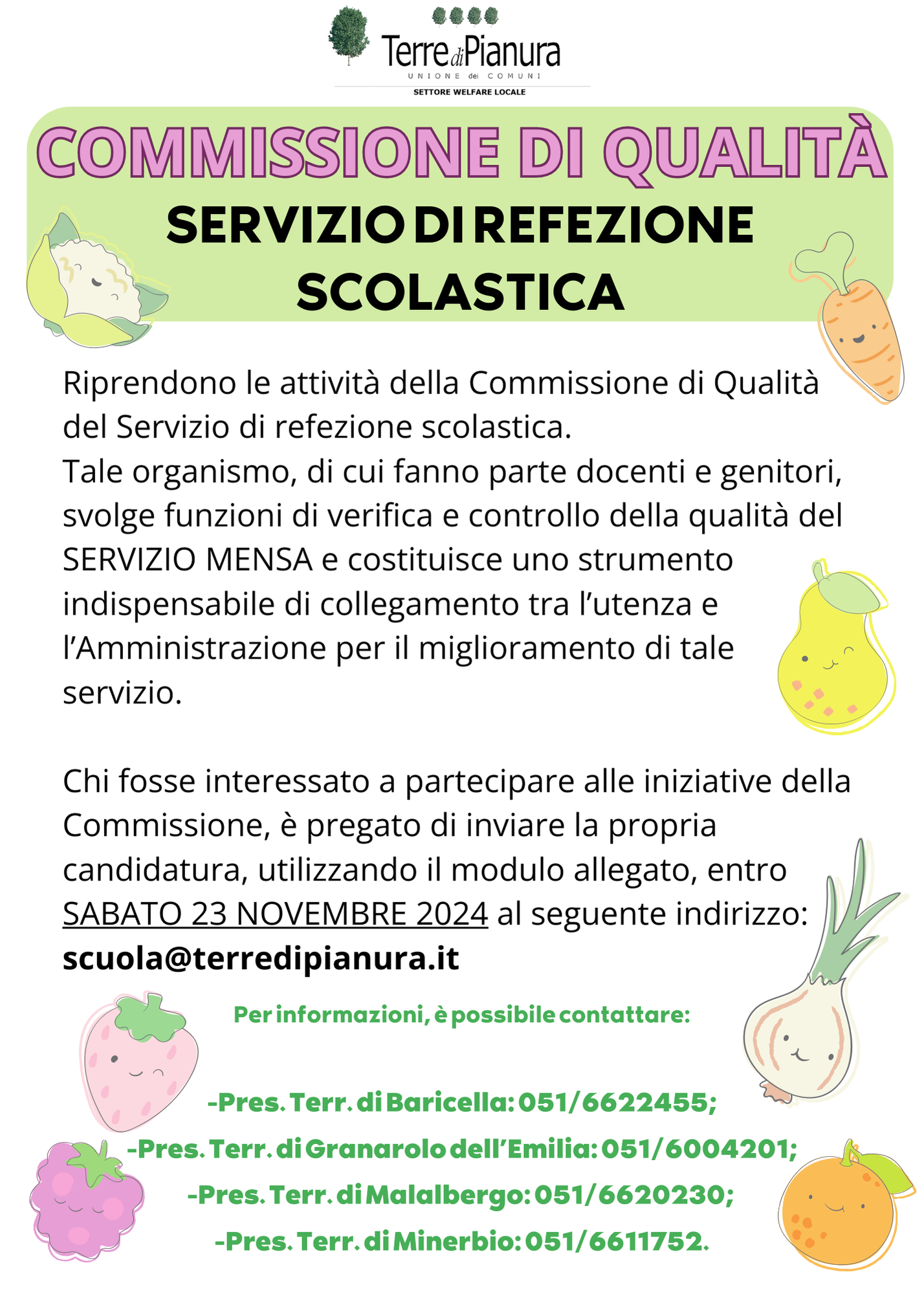 Riprendono le attività della Commissione di Qualità del Servizio di refezione scolastica. Tale organismo, di cui fanno parte docenti e genitori, svolge funzioni di verifica e controllo della qualità del SERVIZIO MENSA e costituisce uno strumento indispensabile di collegamento tra l'utenza e l'Amministrazione per il miglioramento permanente di tale servizio. Chi fosse interessato a partecipare alle iniziative della Commissione, è pregato di inviare la propria candidatura, utilizzando il modulo allegato, entro VENERDI' 23 DICEMBRE 2022 al seguente indirizzo: scuola@terredipianura.it