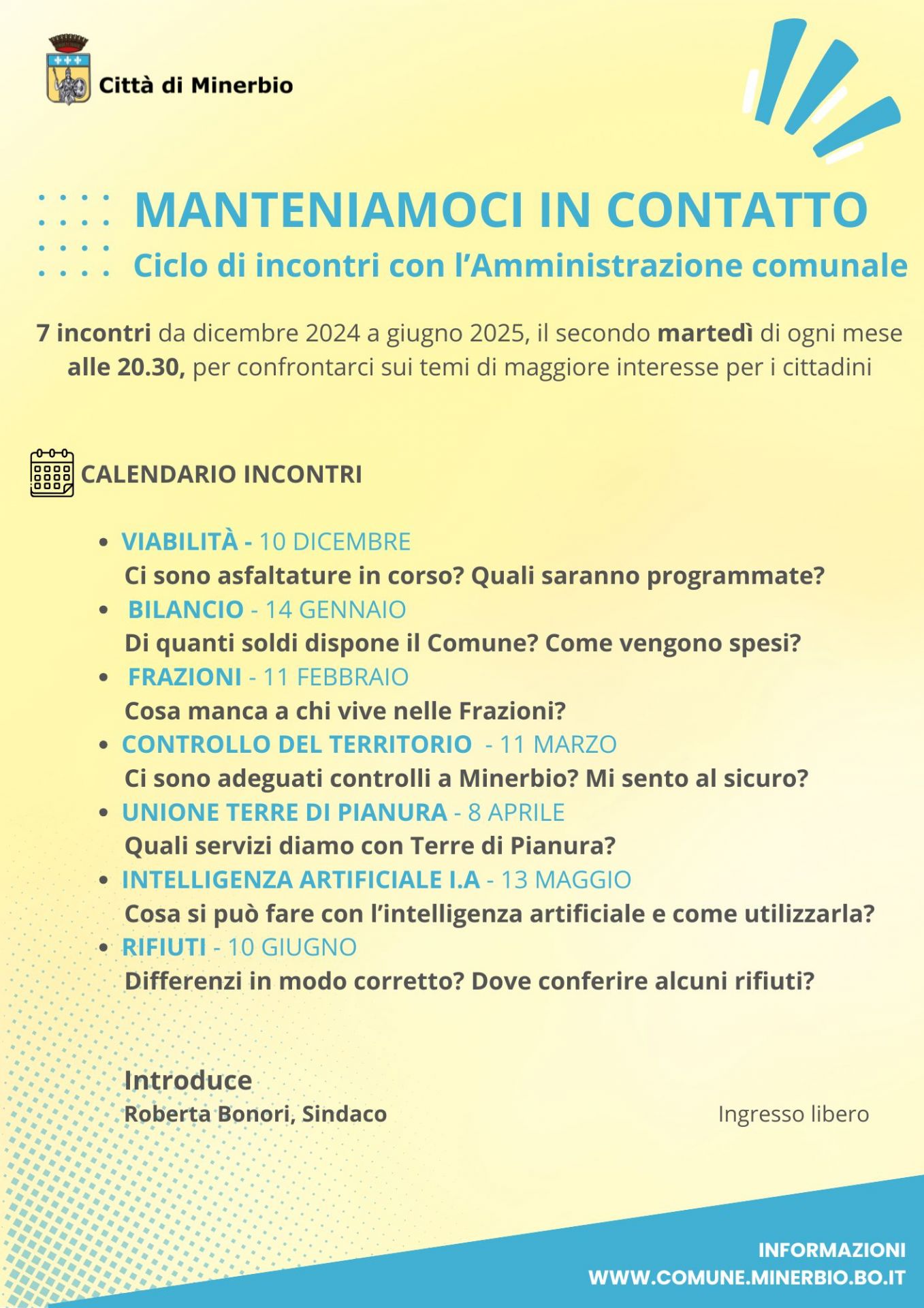 Al via un ciclo di 7 incontri voluto dall'Amministrazione comunale dal titolo "Manteniamoci in contatto" che si terranno da dicembre 2024 a giugno 2025, il secondo martedì di ogni mese alle 20.30, per confronto sui temi di maggiore interesse per i cittadini.