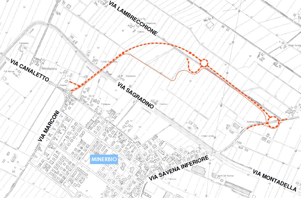 L’asse stradale fungerà da variante alla via Canaletto, allontanando in tal modo il traffico di attraversamento e tutto quello pesante che interessa la parte di Minerbio dove la Strada provinciale 44 “Bassa bolognese” entra nel paese: via Canaletto. La nuova infrastruttura stradale è infatti tangenziale al segmento urbano alla Strada provinciale, si sviluppa dalla rotatoria di via Canaletto in direzione Nord, attraversa il Canale di bonifica, intercetta l’impianto di recupero degli inerti ECORED per poi collegarsi in corrispondenza della vecchia via Lambrecchione con la provinciale “San Donato” attraverso una nuova rotatoria, prevista poco prima della borgata di Piazza Nuova.