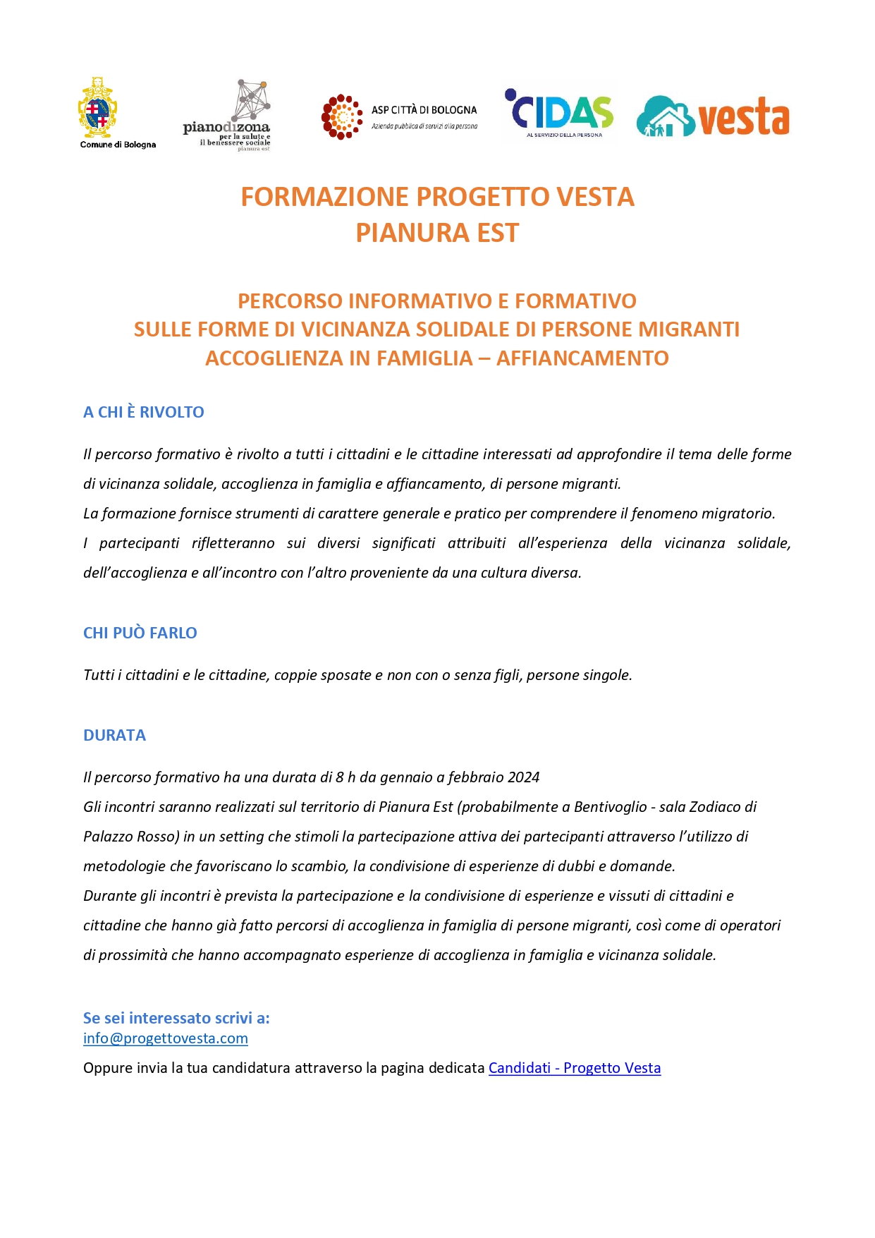 Tra i mesi di gennaio e febbraio verrà realizzato un percorso informativo e formativo relativo al progetto Vesta, previsto all'interno del progetto "Facciamo balotta", esito di uno dei percorsi di co-progettazione con gli Enti di Terzo Settore inseriti nel Piano di Zona per la Salute e il Benessere Sociale del Distretto Pianura Est.