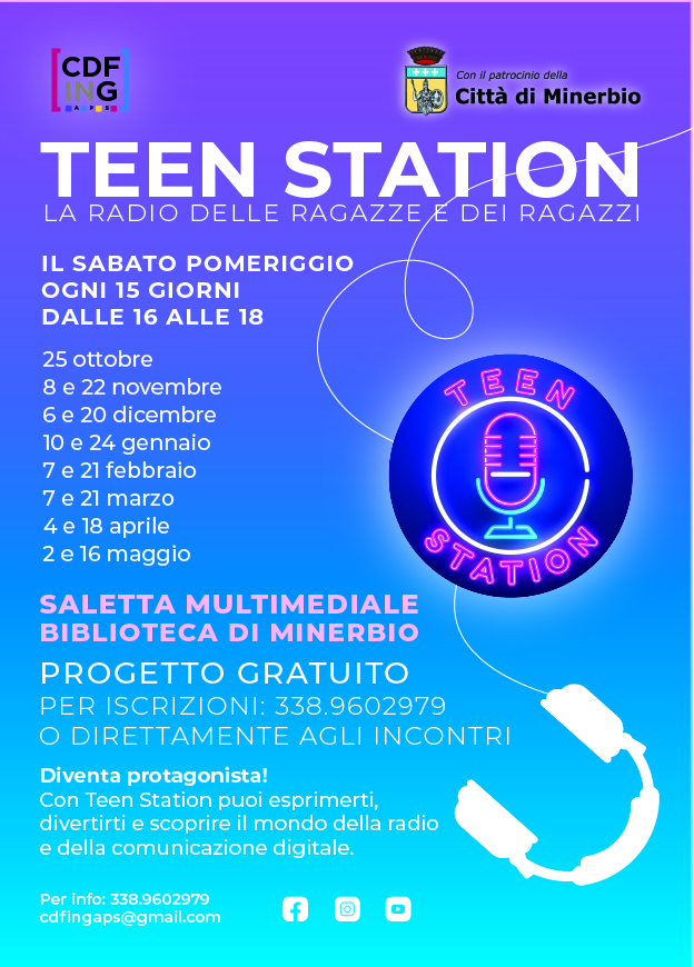 "Teen Station" è uno spazio libero e creativo dove i giovani possono raccontarsi, confrontarsi, sperimentare la comunicazione radiofonica e dare voce alle proprie idee.
