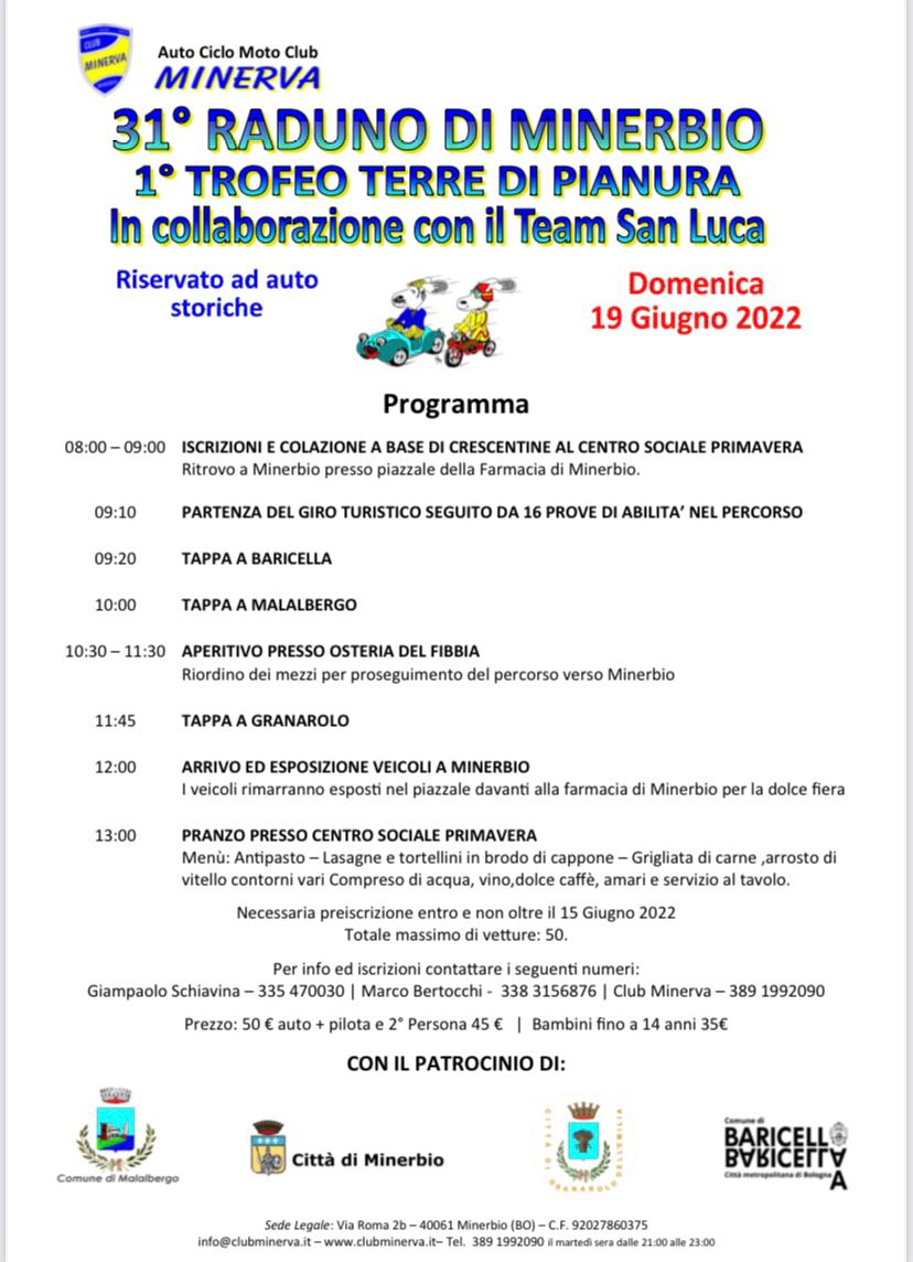 Il Club Minerva, in collaborazione con il Team San Luca, presenta Domenica 19 Giugno il 1° Trofeo Terre di Pianura/ 31° Raduno di Minerbio.