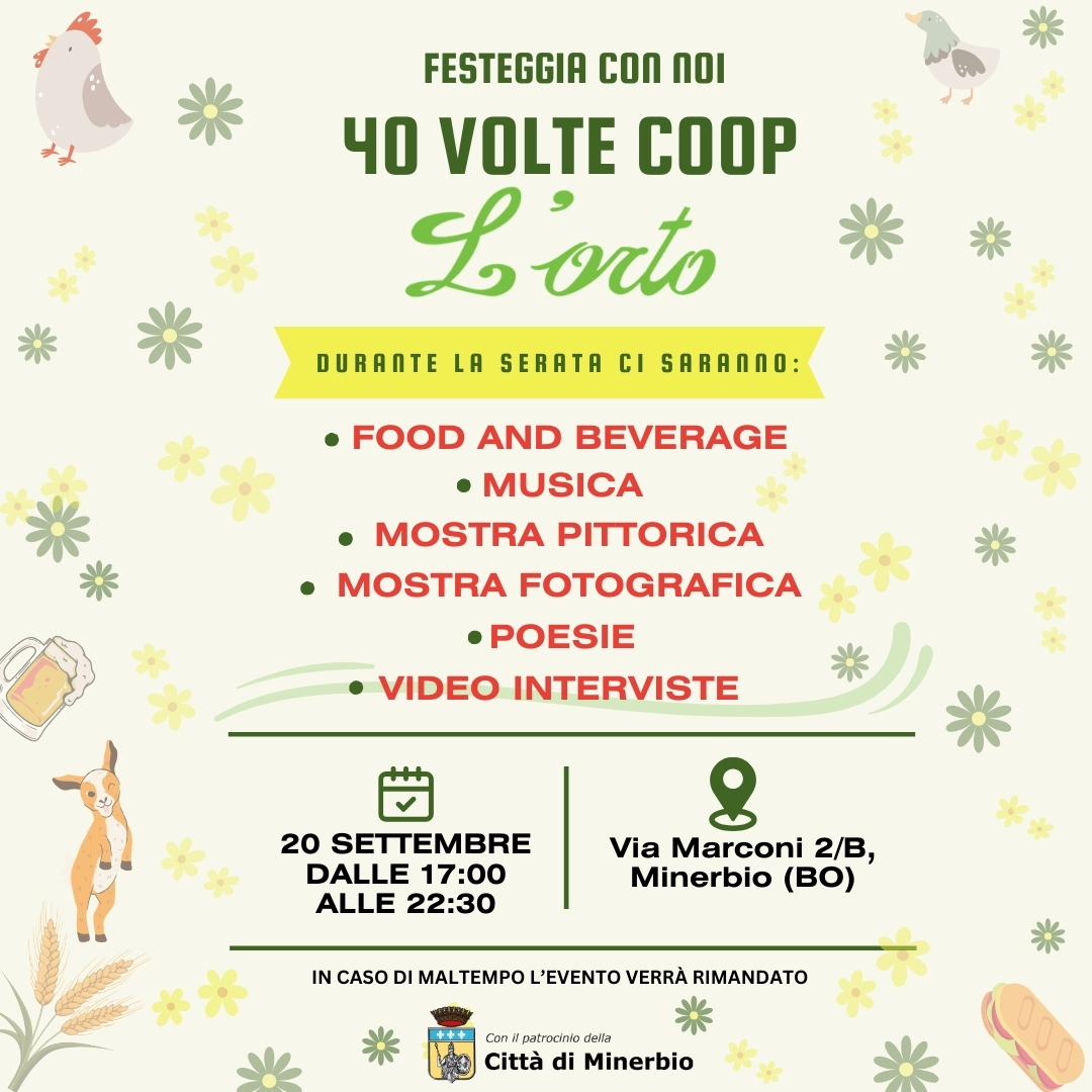 L'iniziativa 40 volte Coop L'Orto, causa maltempo, è rinviata a Sabato 28 settembre 2024 dalle ore 11.00 alle ore 18.00 in via Marconi 2/B a Minerbio, per festeggiare i 40 anni di attività della Cooperativa L'Orto, con il patrocinio del Comune di Minerbio.