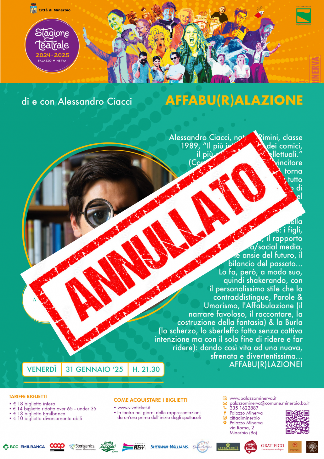 Si comunica che, per motivi di salute dell'artista, è stato annullato lo spettacolo "Affabu(r)lazione" - di e con Alessandro Ciacci - in programma il 31 gennaio 2025, presso il Teatro Palazzo Minerva.