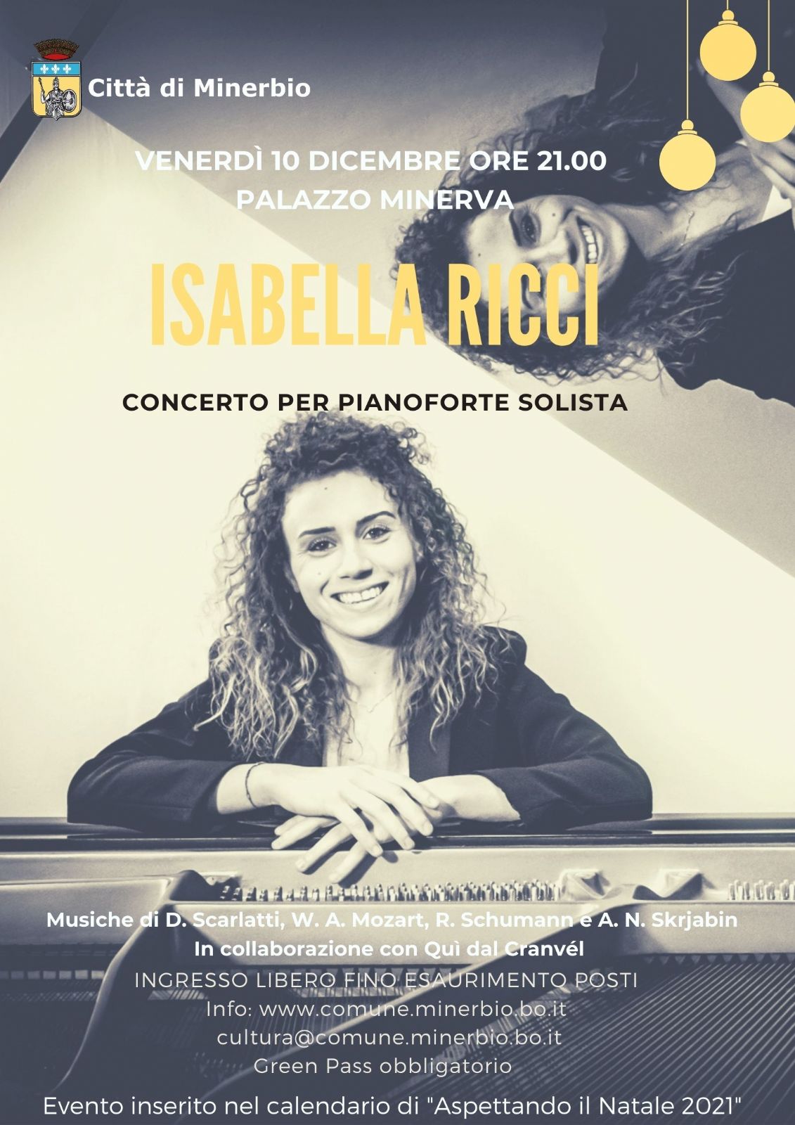 Venerdì 10 dicembre 2021 alle ore 21.00, a Palazzo Minerva si svolgerà il Concerto di Isabella Ricci per pianoforte solista: musiche di D. Scarlatti, W. A. Mozart, R. Schumann e A. N. Skrjabin.