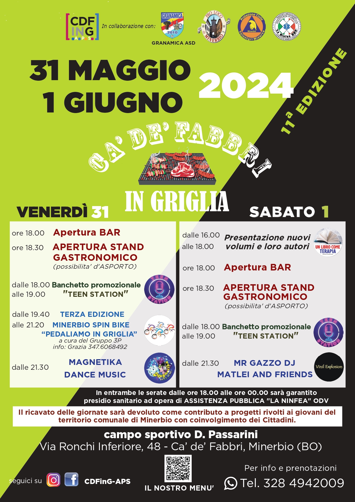 Venerdì 31 maggio e sabato 1 giugno si svolgerà la 11° edizione di Ca' De Fabbri in griglia, a partire dalle ore 18 fino a mezzanotte presso il Campo sportivo D. Passarini (in via Ronchi Inferiore, 48).