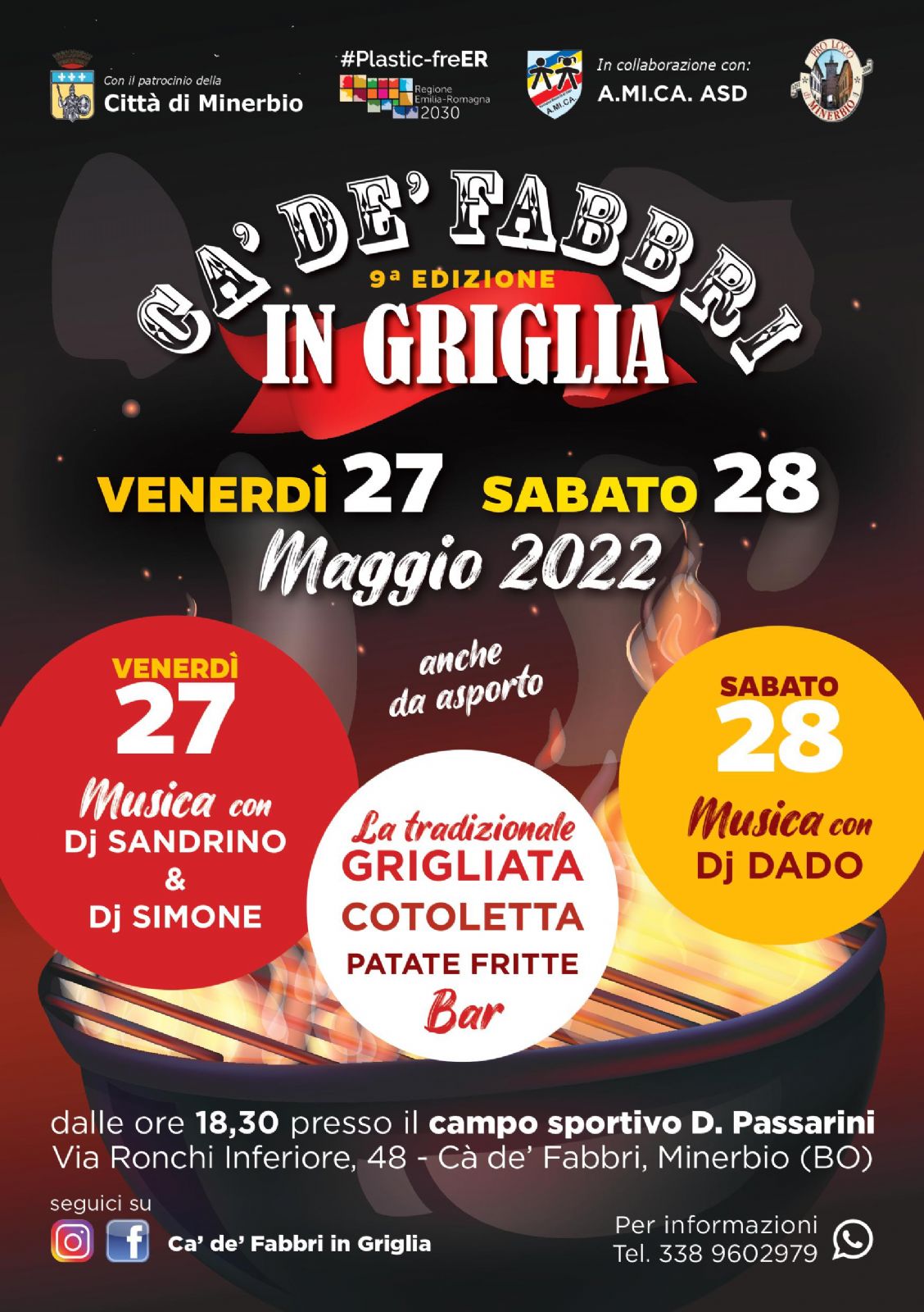 Venerdì 27 e sabato 28 maggio 2022 dalle ore 18.30 presso il Centro Sportivo D. Passarini a Ca' de' Fabbri si svolgerà la 9a edizione di "Ca' de' Fabbri in Griglia"