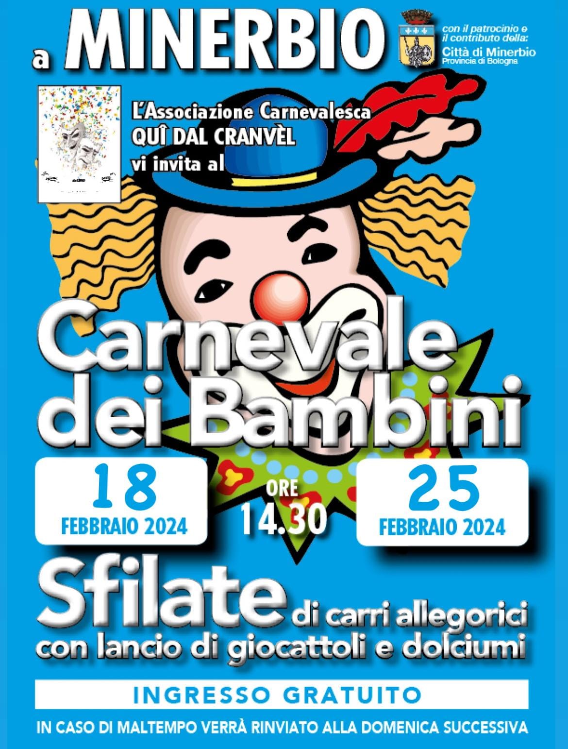L'associazione Qui dal Cranvèl organizza, con il patrocinio ed il contribuito del Comune di Minerbio, organizza domenica 18 e domenica 25 febbraio 2024 dalle ore 14.30 lungo via Garibaldi a Minerbio Il CARNEVALE DEI BAMBINI, con sfilate di carri allegorici con lancio di giocattoli e dolciumi.