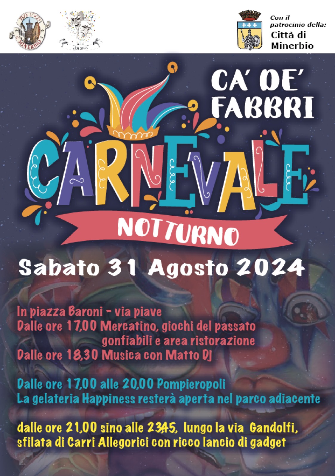 Sabato 31 agosto 2024 si terrà il Carnevale notturno a Ca' de' Fabbri, Piazza Baroni-via Piave.