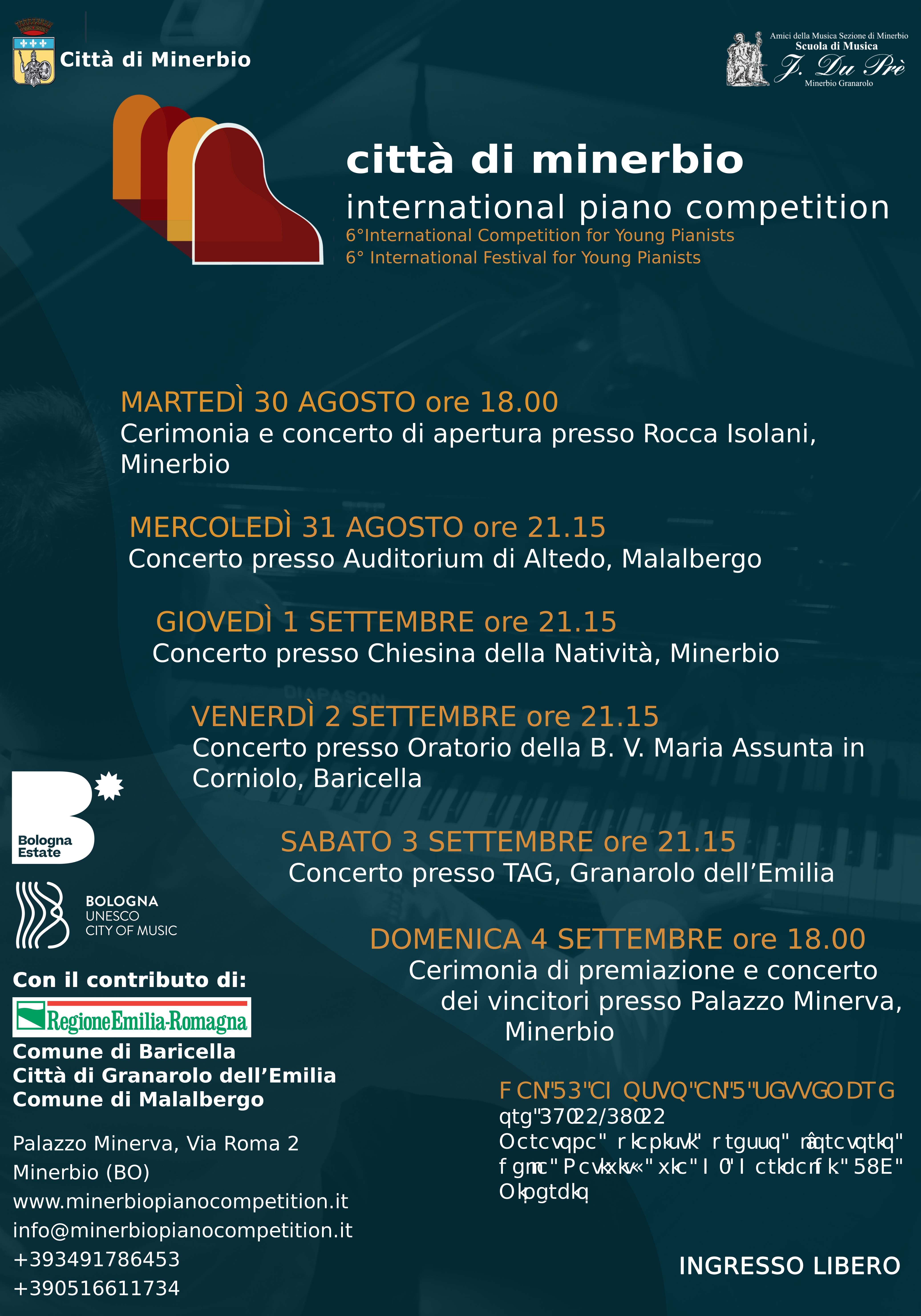 Martedì 30 agosto alle ore 18.00 presso Rocca Isolani si terrà il Concerto di apertura del Concorso pianistico internazionale "Città di Minerbio" (30 agosto - 4 settembre), giunto alla sua sesta edizione e realizzato in collaborazione con i Comuni dell'Unione Terre di Pianura (Baricella, Granarolo dell'Emilia e Malalbergo)
