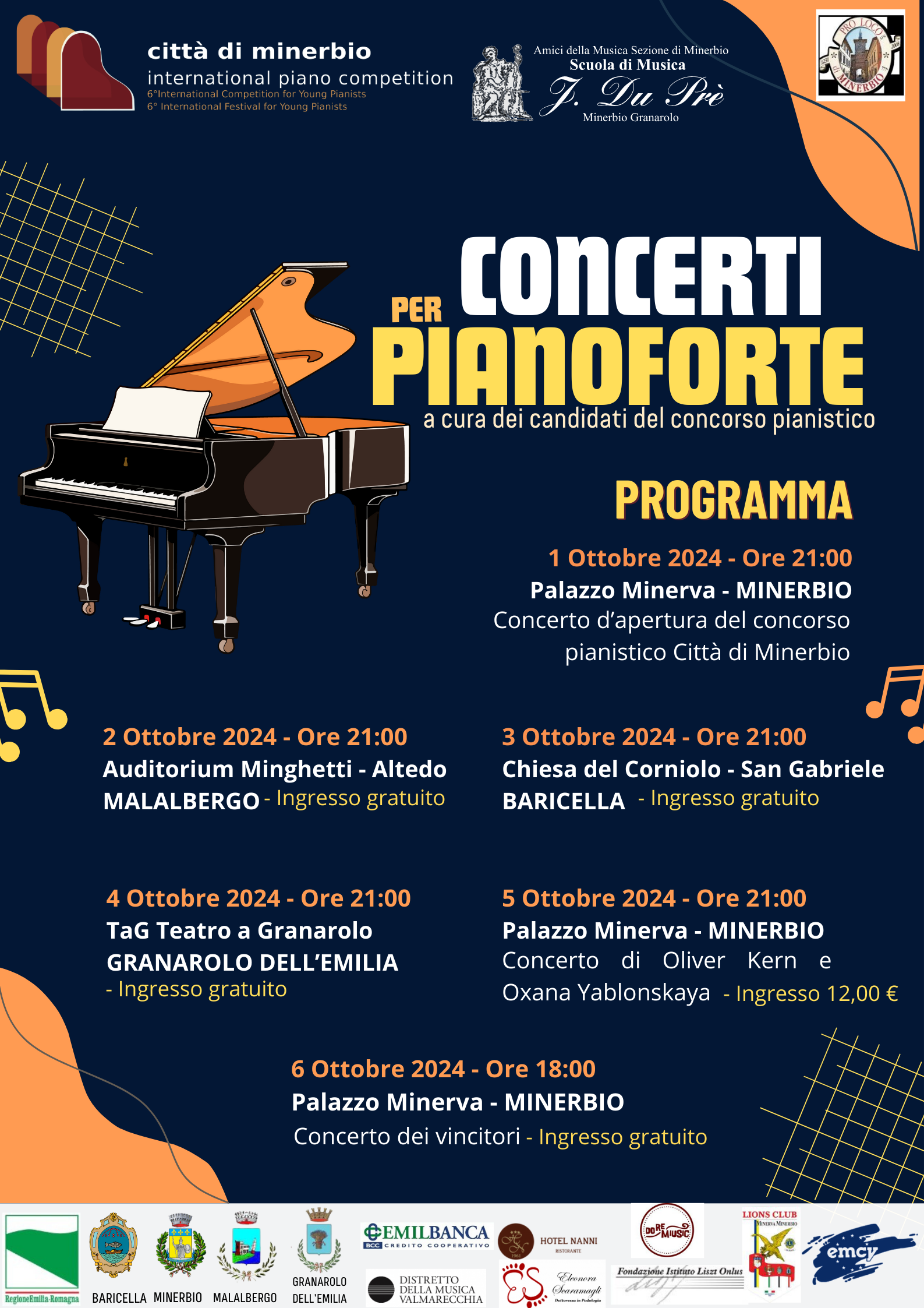 Dall'1 al 6 ottobre 2024 la Città di Minerbio ospiterà l'ottava edizione del Concorso Pianistico internazionale "Città di Minerbio": un calendario ricco di concerti diffusi per il territorio minerbiese e nei comuni limitrofi di Baricella, Granarolo dell'Emilia e Malalbergo.