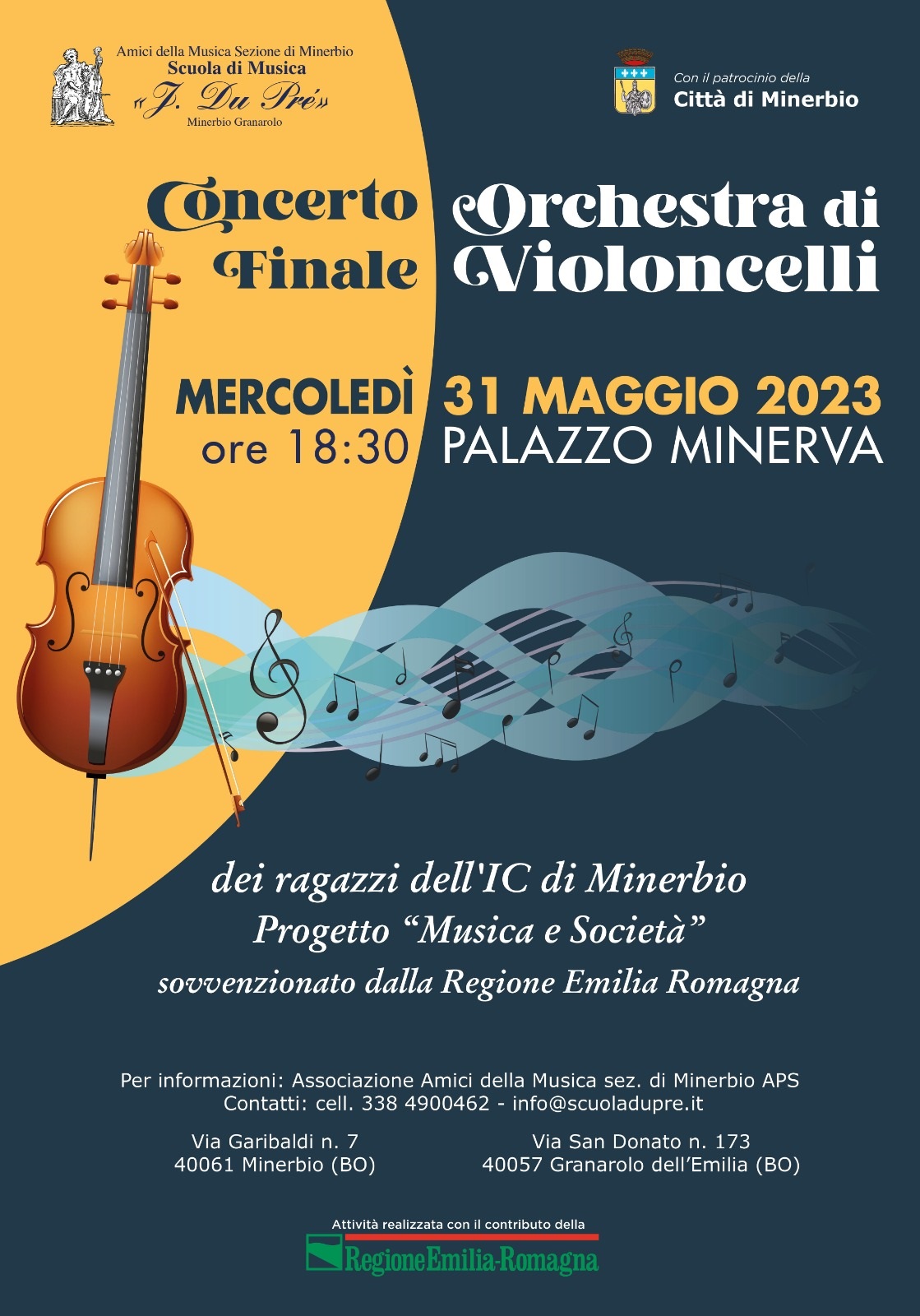 Mercoledì 31 maggio 2023 alle ore 18,30 a Palazzo Minerva si terrà il Concerto finale del progetto "Musica e società", sovvenzionato dalla Regione Emilia-Romagna dell'Orchestra di violoncelli dei ragazzi dell'Istituto Comprensivo di Minerbio