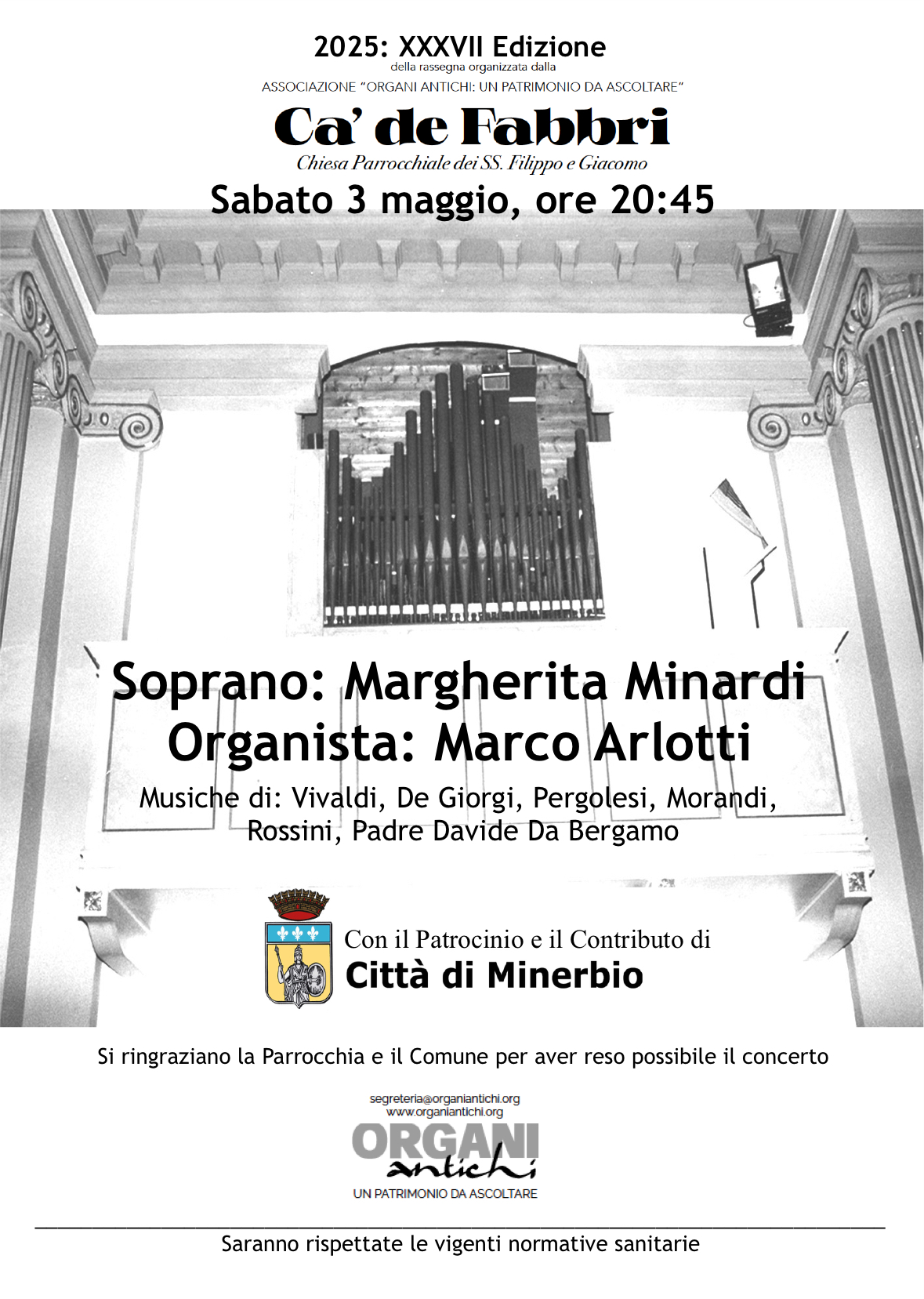 Sabato 3 maggio 2025 alle ore 20.45 si terrà il concerto di organi antichi presso la Chiesa Parrocchiale dei SS. Filippo e Giacomo di Ca' de' Fabbri, all'interno della XXXV edizione della rassegna organizzata dall'Associazione Organi Antichi: un patrimonio da ascoltare