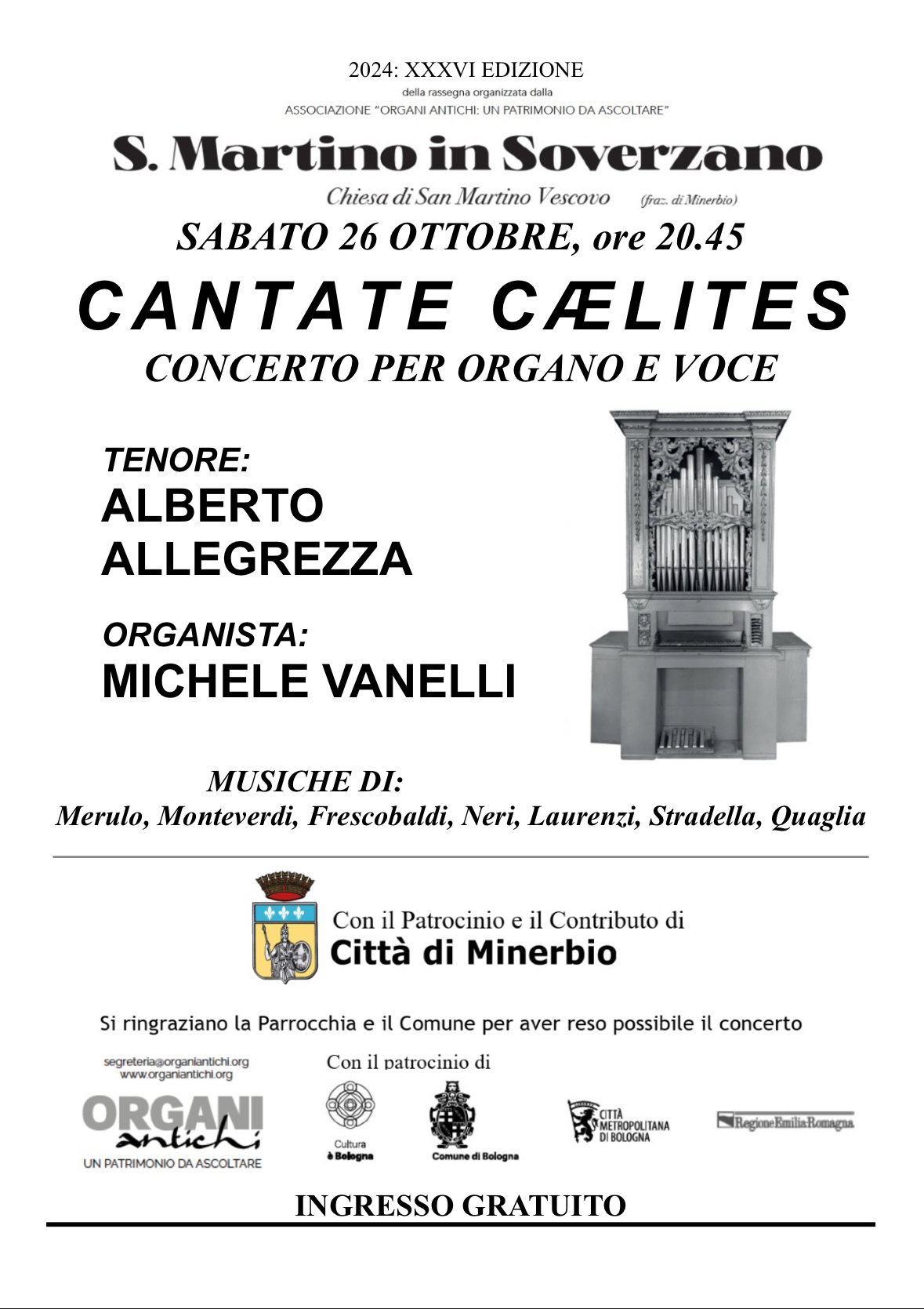 Sabato 26 ottobre 2024 alle ore 20.45 si terrà il concerto per voce e organo Cantate Caelites presso la Chiesa di San Martino Vescovo a San Martino in Soverzano all'interno della XXXVI edizione della rassegna organizzata, con il patrocinio del Comune di Minerbio, dall'Associazione Organi Antichi: un patrimonio da ascoltare
