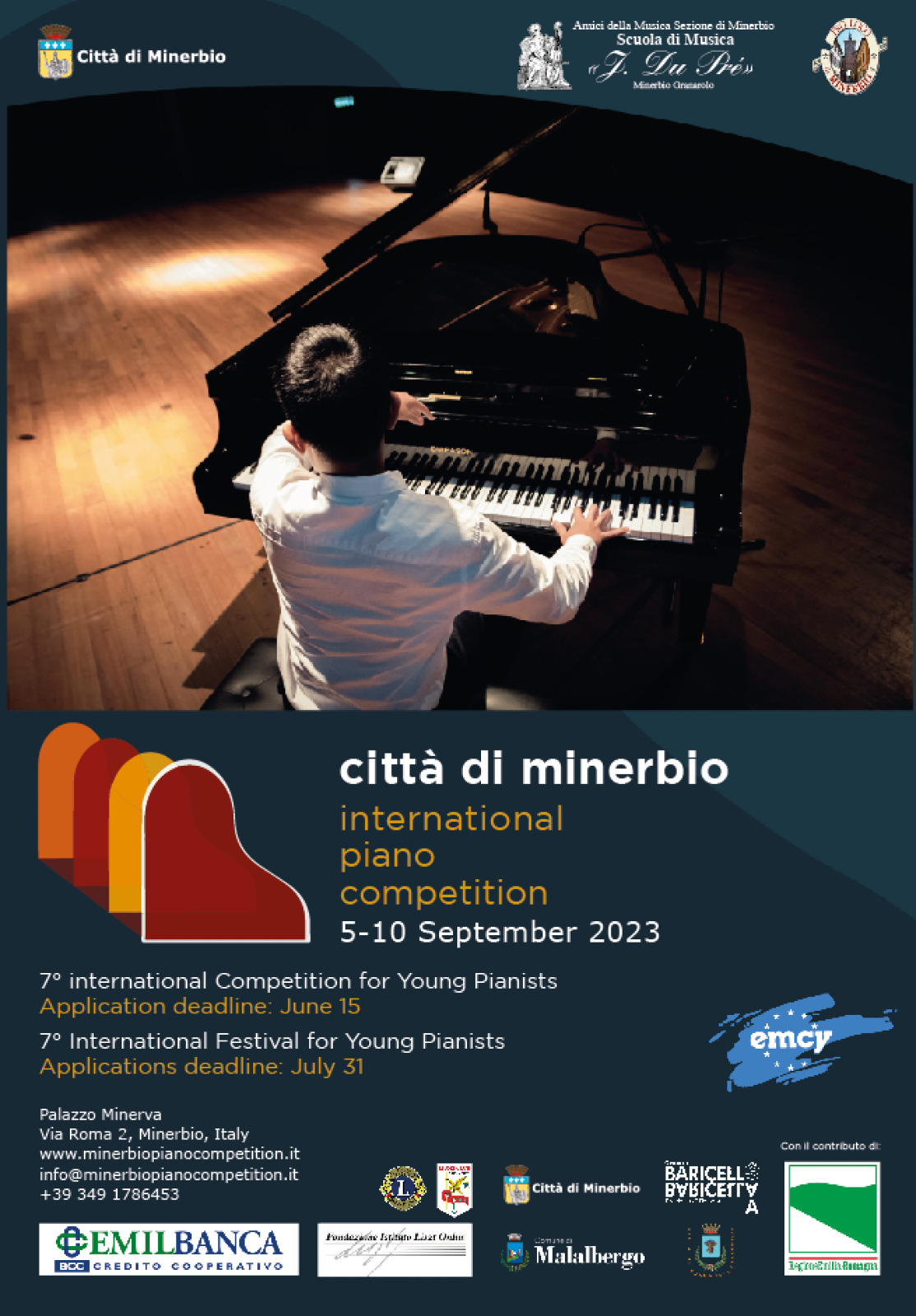 Dal 5 al 10 settembre 2023 la Città di Minerbio ospiterà la settima edizione del Concorso Pianistico internazionale "Città di Minerbio": un calendario ricco di concerti diffusi per il territorio minerbiese e nei comuni limitrofi di Baricella, Granarolo dell'Emilia e Malalbergo.