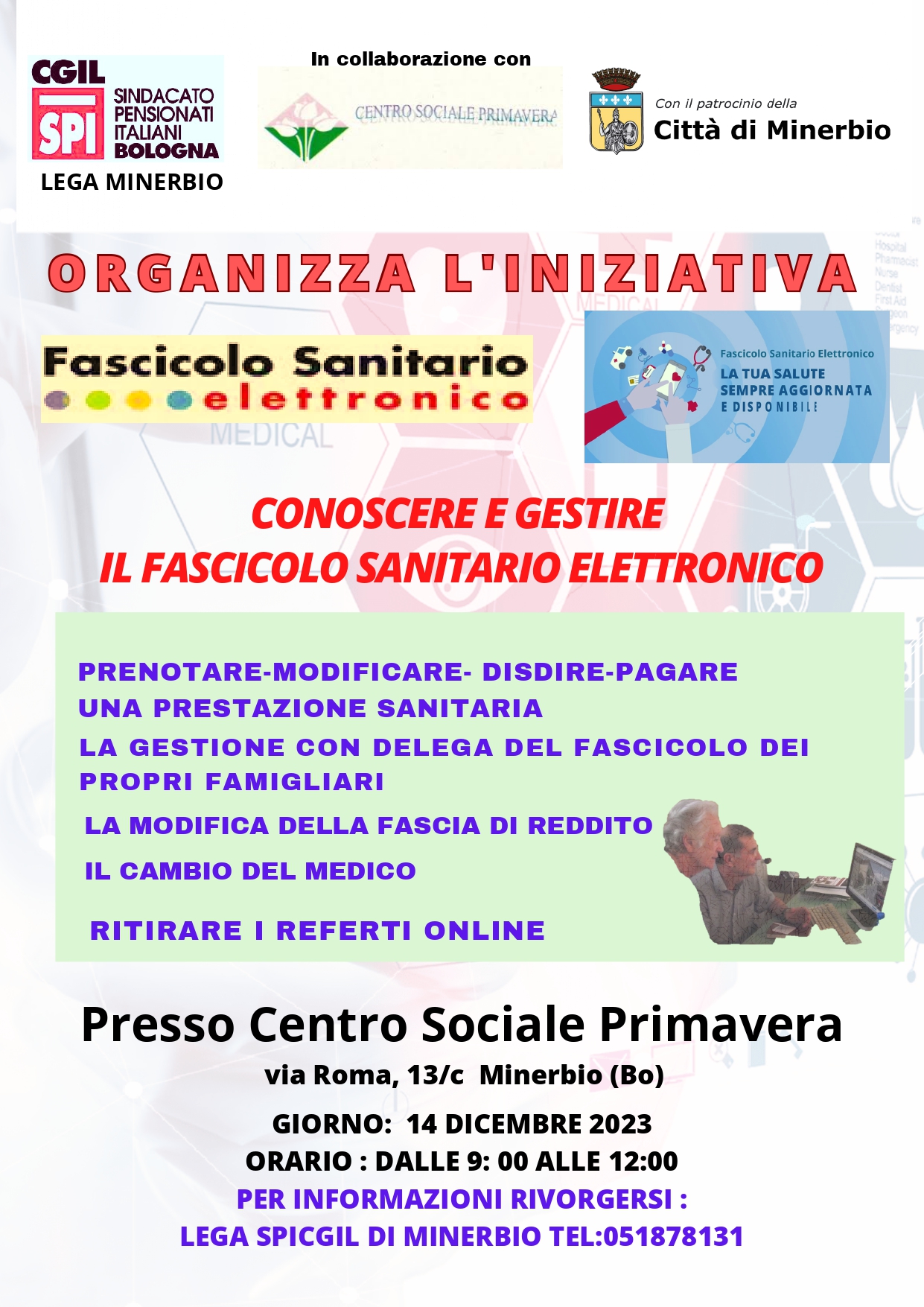Giovedì 14 dicembre 2023 il Sindacato dei pensionati italiano Bologna - Lega SPI CGIL Minerbio in collaborazione con il Centro sociale Primavera e il patrocinio del Comune di Minerbio organizza un incontro sul tema "Conoscere e gestire il fascicolo sanitario elettronico" presso il Centro sociale Primavera (via Roma 137c Minerbio) dalle ore 9.00 alle ore 12.00.