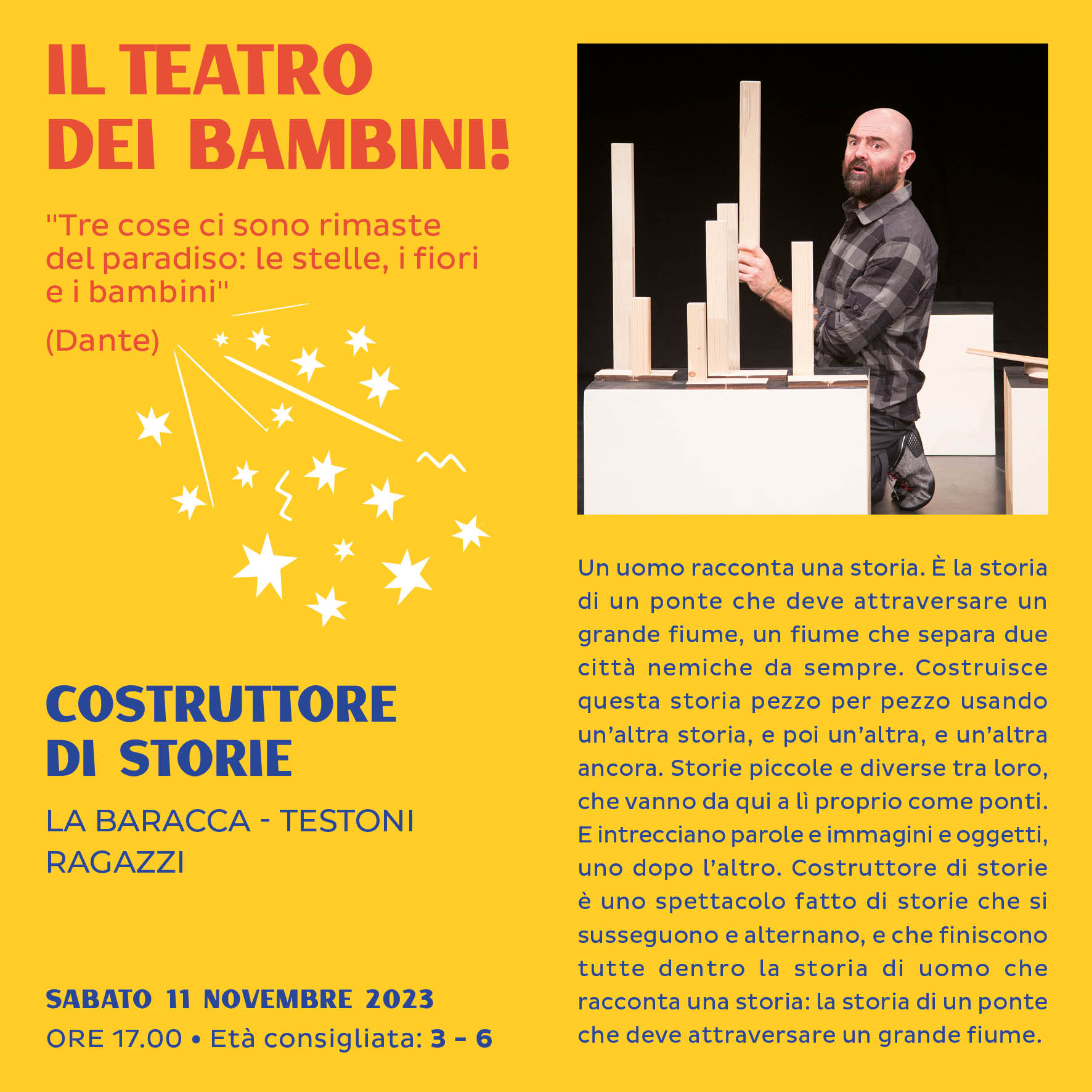 In scena Costruttore di storie, di e con La Baracca - Testoni ragazzi. Consigliato dai 3 ai 6 anni.