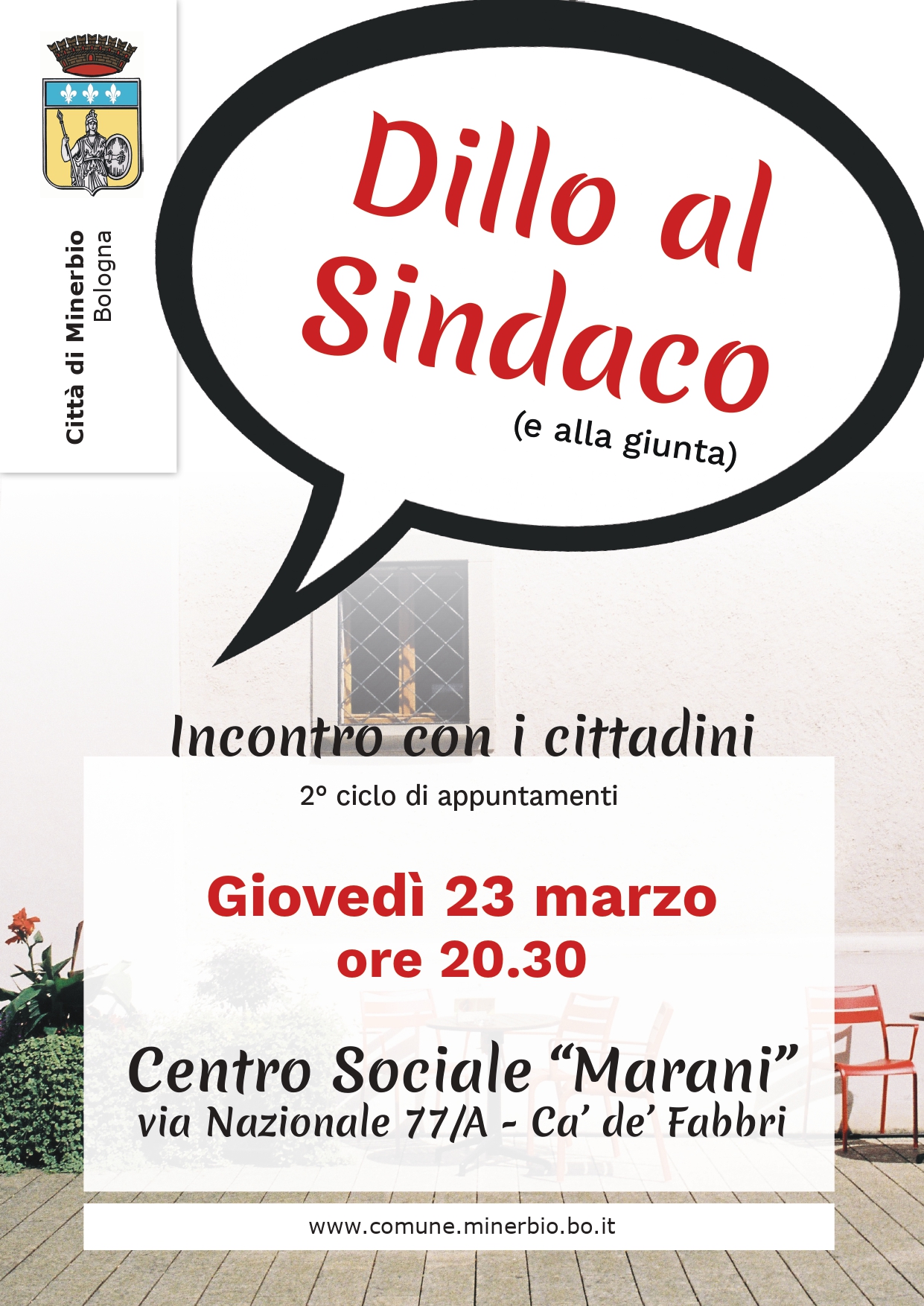 Giovedì 23 marzo alle ore 20:30 presso il Centro Sociale “Marani” in via Nazionale 77/A a Ca’ de’ Fabbri si terrà l'appuntamento di Dillo al Sindaco, durante il quale il primo cittadino e la giunta incontreranno la cittadinanza