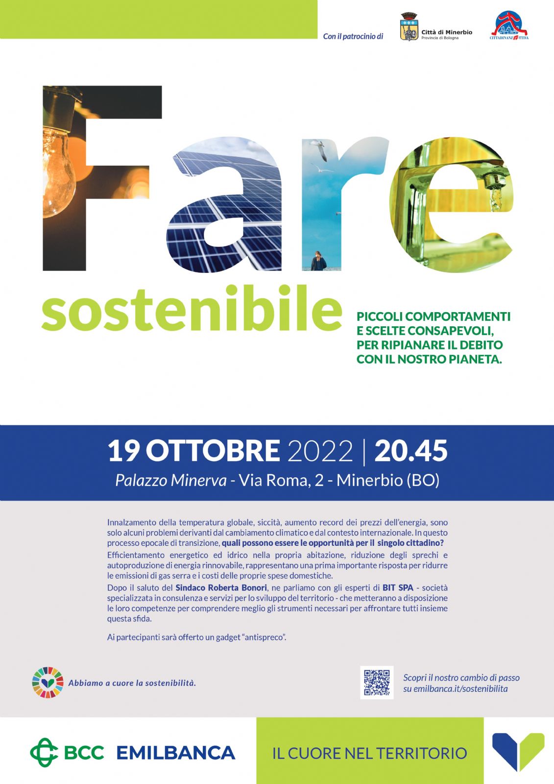 EmilBanca organizza mercoledì 19 ottobre 2022 alle ore 20.45 presso Palazzo Minerva un convegno dal titolo "FARE SOSTENIBILE" sui temi dei piccoli comportamenti e scelte sostenibili, per ripianare il debito con il nostro pianeta.