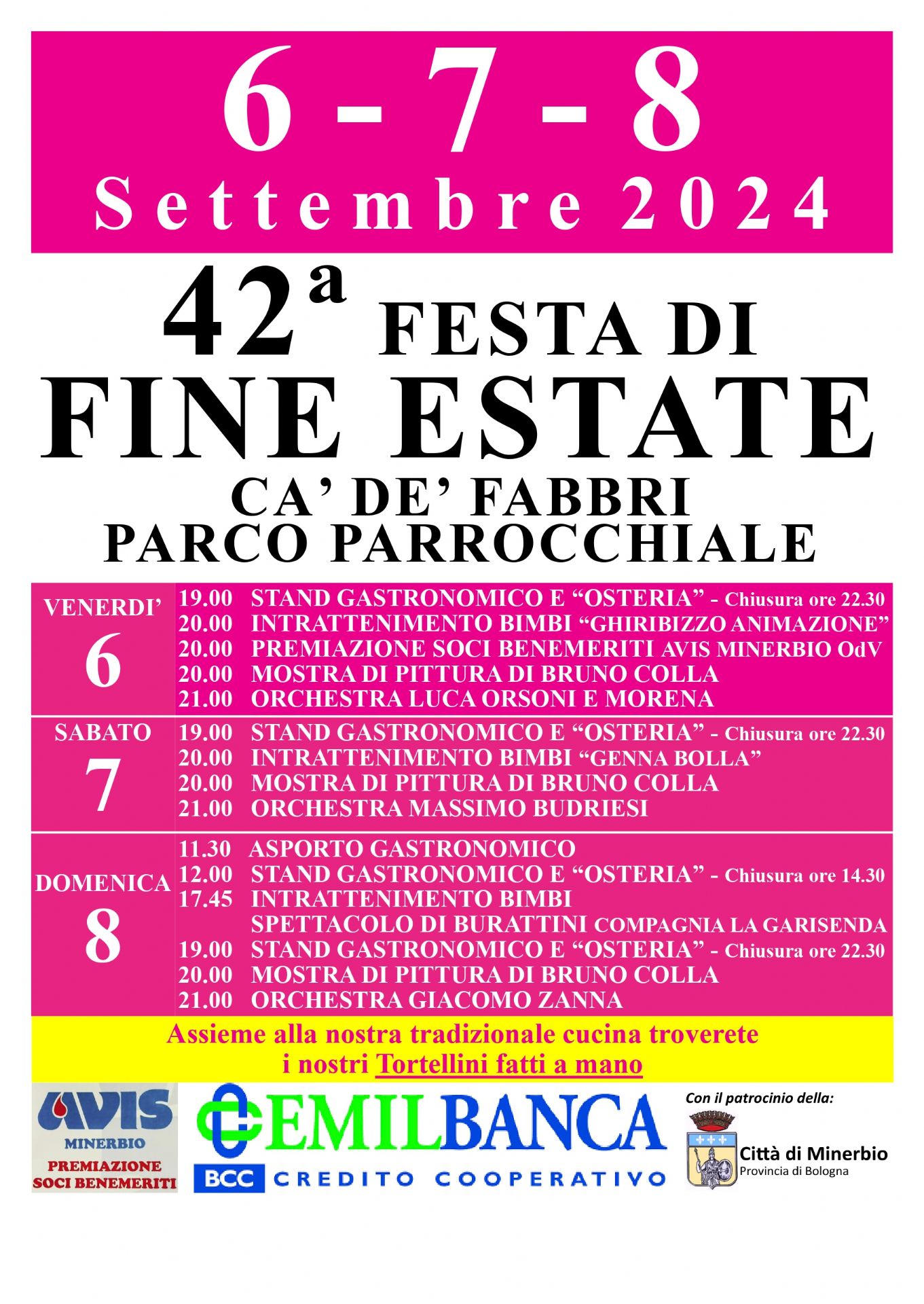 Dal 6 all'8 settembre 2024 si svolgerà la 42ᵃ festa di fine estate di Ca' de' Fabbri nel parco parrocchiale.