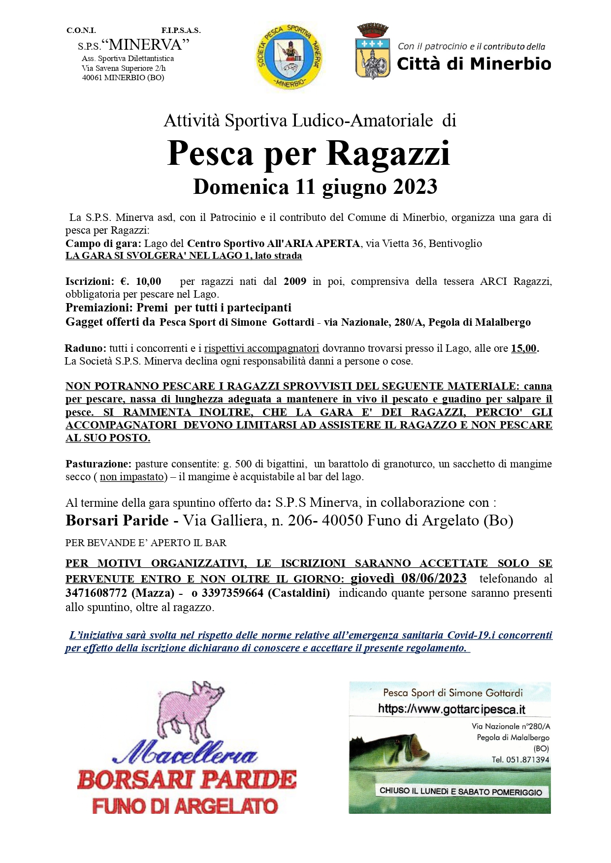 Domenica 11 giugno 2023 presso il Centro sportivo All'Aria Aperta a Bentivoglio si svolgerà la Gara di Pesca per Ragazzi, per i nati dal 2009 in poi, organizzata da Società Pesca Sportiva Minerva Asd.