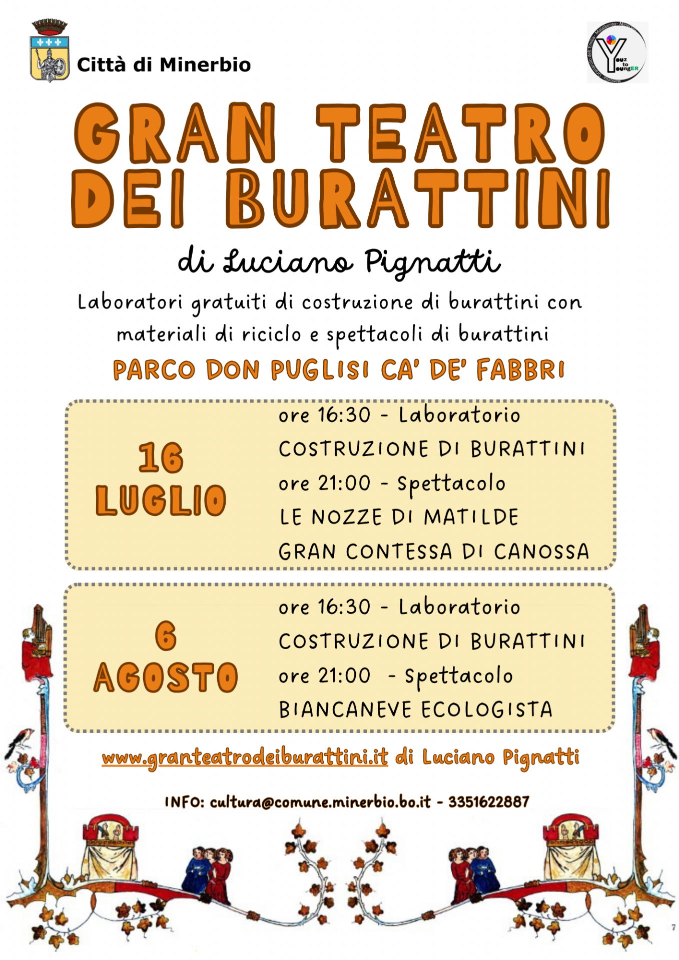 Mercoledì 06 agosto il Parco Don Puglisi di Ca' De' Fabbri si trasformerà in un laboratorio all'insegna della creatività e fantasia! grazie al Gran Teatro dei Burattini di Luciano Pignatti, i più piccoli (e non solo!) potranno partecipare a un coinvolgente laboratorio di costruzione dei burattini, utilizzando materiali di riciclo. Un'occasione unica per dare vita a personaggi straordinari con le proprie mani.