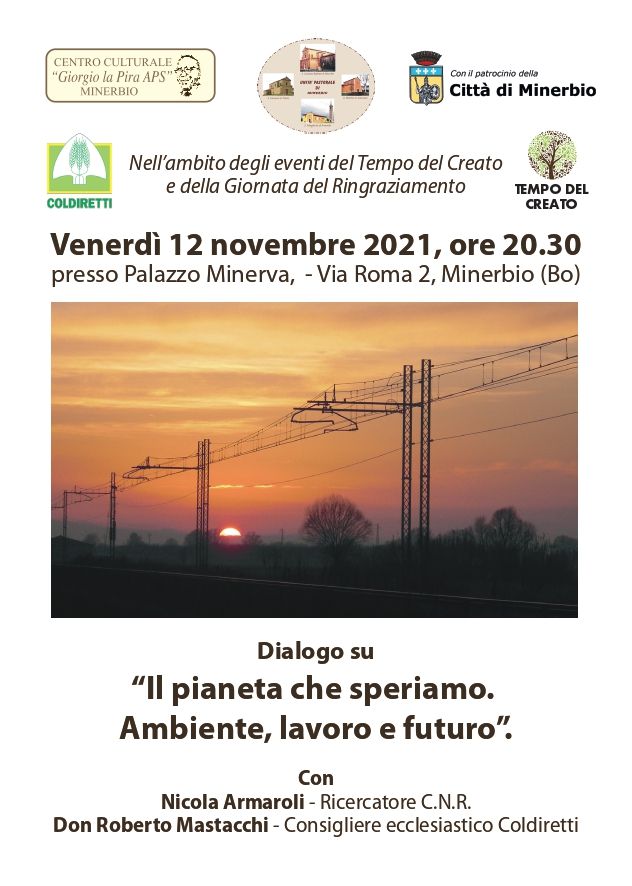 Venerdì 12 novembre 2021, alle ore 20.30, presso Palazzo Minerva, nell'ambito degli eventi del Tempo del Creato e della Giornata del Ringraziamento, si terrà l'incontro "Il pianeta che speriamo. Ambiente, lavoro e futuro",