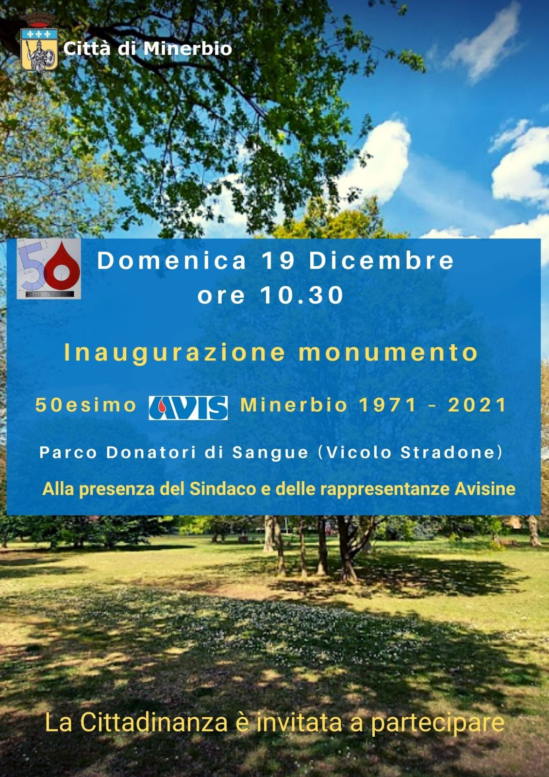 Domenica 19 dicembre alle ore 10.30 si terrà l'inaugurazione del monumento dedicato al 50esimo anniversario dell'Avis Minerbio (1971 - 2021)