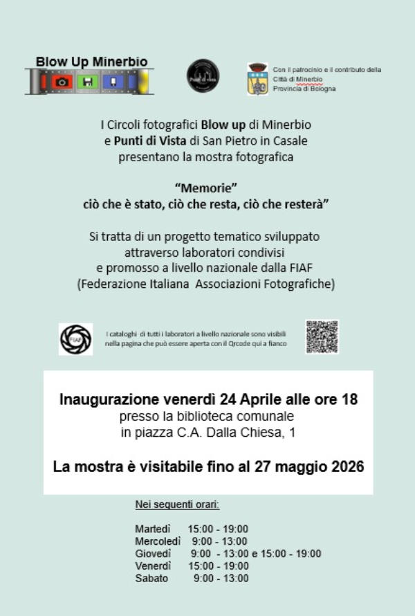Venerdì 24 aprile alle ore 18 presso la Biblioteca Comunale Prometeo di Minerbio inaugurazione della mostra fotografica "Memorie: ciò che è stato, ciò che resta, ciò che sarà" a cura del Circolo fotografico Blow up, con il patrocinio del Comune di Minerbio.