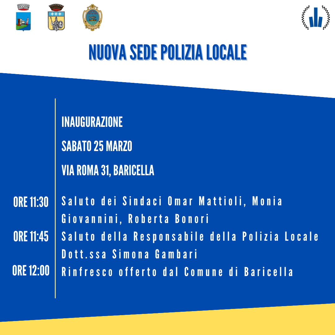 La cittadinanza è invitata all'inaugurazione della Sede Unica del Servizio Associato di Polizia Locale che si terrà sabato 25 marzo 2023, alle ore 11:30 a Baricella in via Roma n. 31.