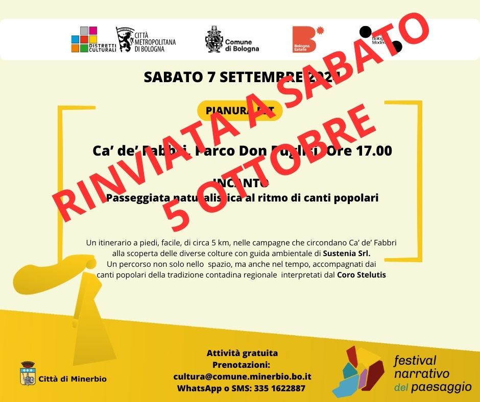 All'interno del Festival del Narrativo del Paesaggio 2024 "Orizzonti che si incontrano", il Comune di Minerbio organizza: INCANTO. Passeggiata naturalistica di circa 5 km nelle campagne di Ca' de' Fabbri, al ritmo di canti popolari e con guida naturalistica.