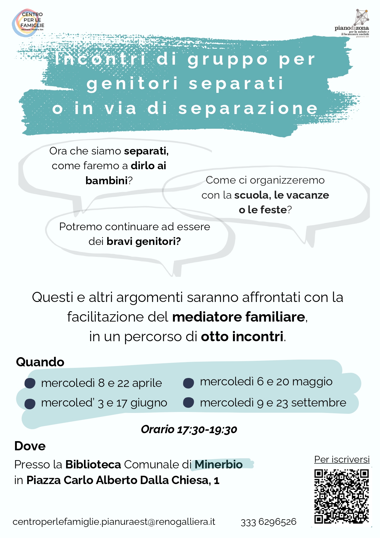 Il Centro per le famiglie del Distretto Pianura est organizza presso la Biblioteca Comunale "Prometeo" - Piazza C.A. Dalla Chiesa, 1 Minerbio - un ciclo di 8 incontri con la facilitazione del mediatore familiare
