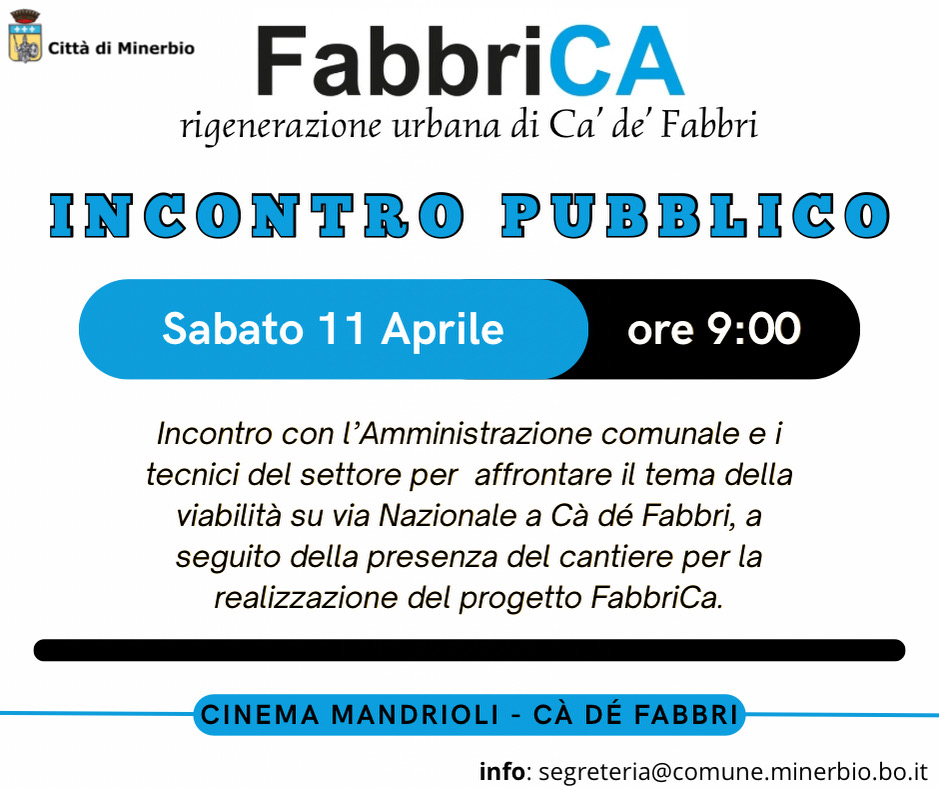 Sabato 11 aprile 2026 alle ore 9.00 presso il Nuovo Cinema Mandriolo a Ca' de' Fabbri si terrà un incontro pubblico con l'Amministrazione comunale e i tecnici del settore per affrontare il tema della viabilità su via Nazionale a Ca' de' Fabbri, a seguito della presenza del cantiere per la realizzazione del progetto FabbriCA.