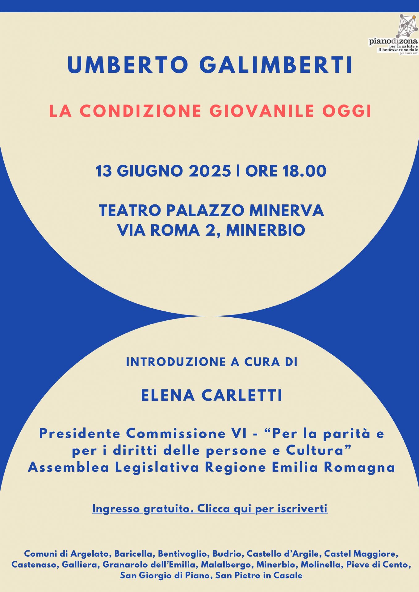 Venerdì 13 giugno 2025, alle ore 18.00, presso il Teatro Palazzo Minerva di Minerbio, si terrà l’incontro pubblico dal titolo La condizione giovanile oggi, con l’intervento del professor Umberto Galimberti.