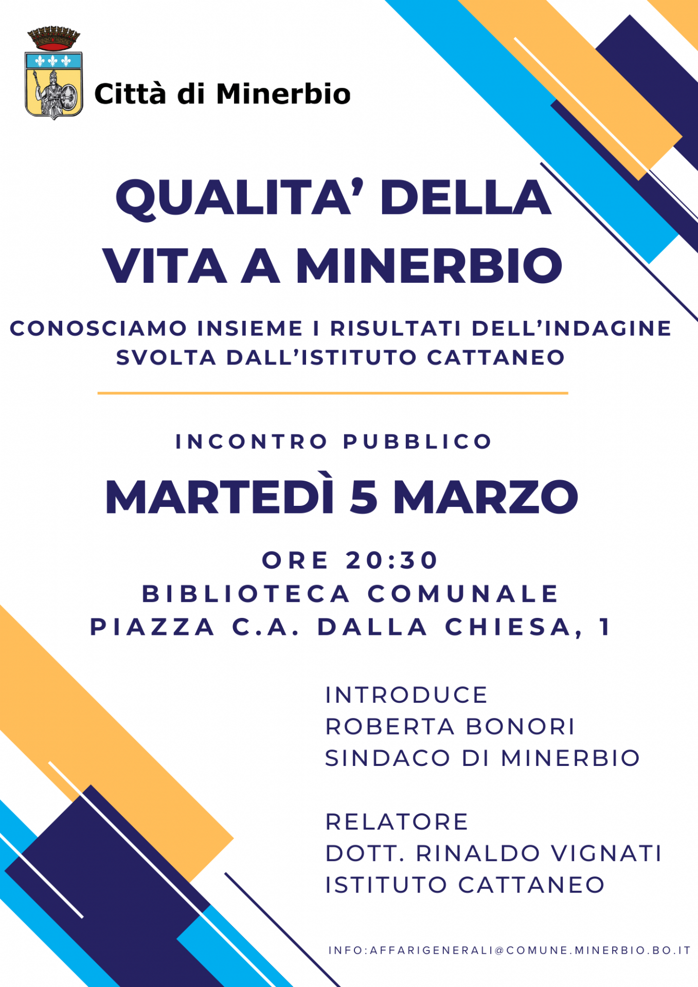 Il Comune di Minerbio, nel suo impegno per essere vicino ai cittadini e rispondere alle loro esigenze, ha chiesto alla Fondazione di ricerca Istituto Carlo Cattaneo di svolgere un’indagine sulle opinioni che i residenti di Minerbio hanno nei confronti dei servizi erogati dall’amministrazione comunale e sulla qualità della vita.