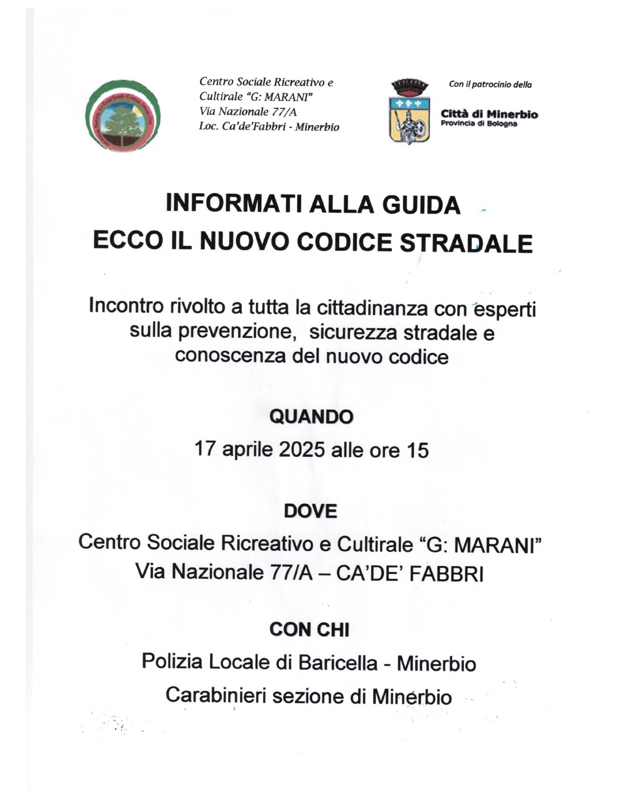 Giovedì 17 aprile 2025, alle ore 15:00, presso il Centro Sociale Ricreativo e Culturale " G. Marani" si terrà un incontro - con il patrocinio del Comune di Minerbio - rivolto a tutta la cittadinanza per un approfondimento sul nuovo codice della strada.