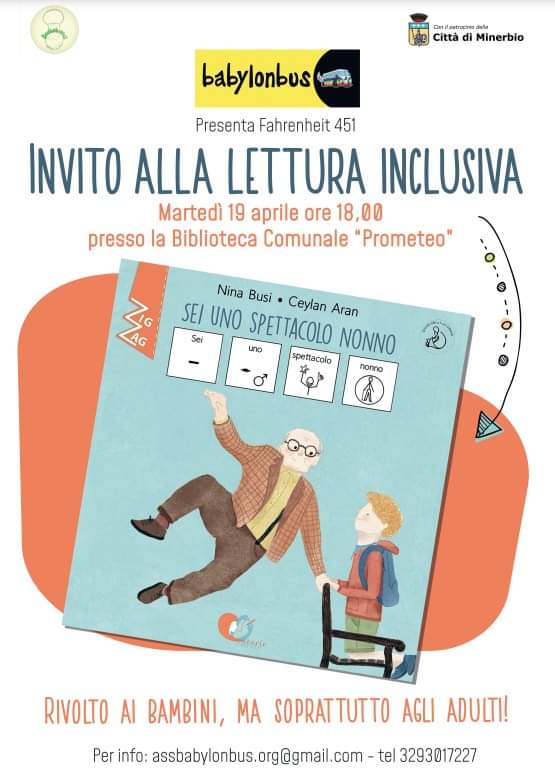 Martedì 19 Aprile, alle ore 18.00 presso la Biblioteca Comunale Prometeo, "Invito alla lettura inclusiva" a cura di Associazione Babylonbus, rivolto a bambini, soprattutto agli adulti con il volume "Sei uno spettacolo nonno" di Nina Busi e Ceylan Aran.
