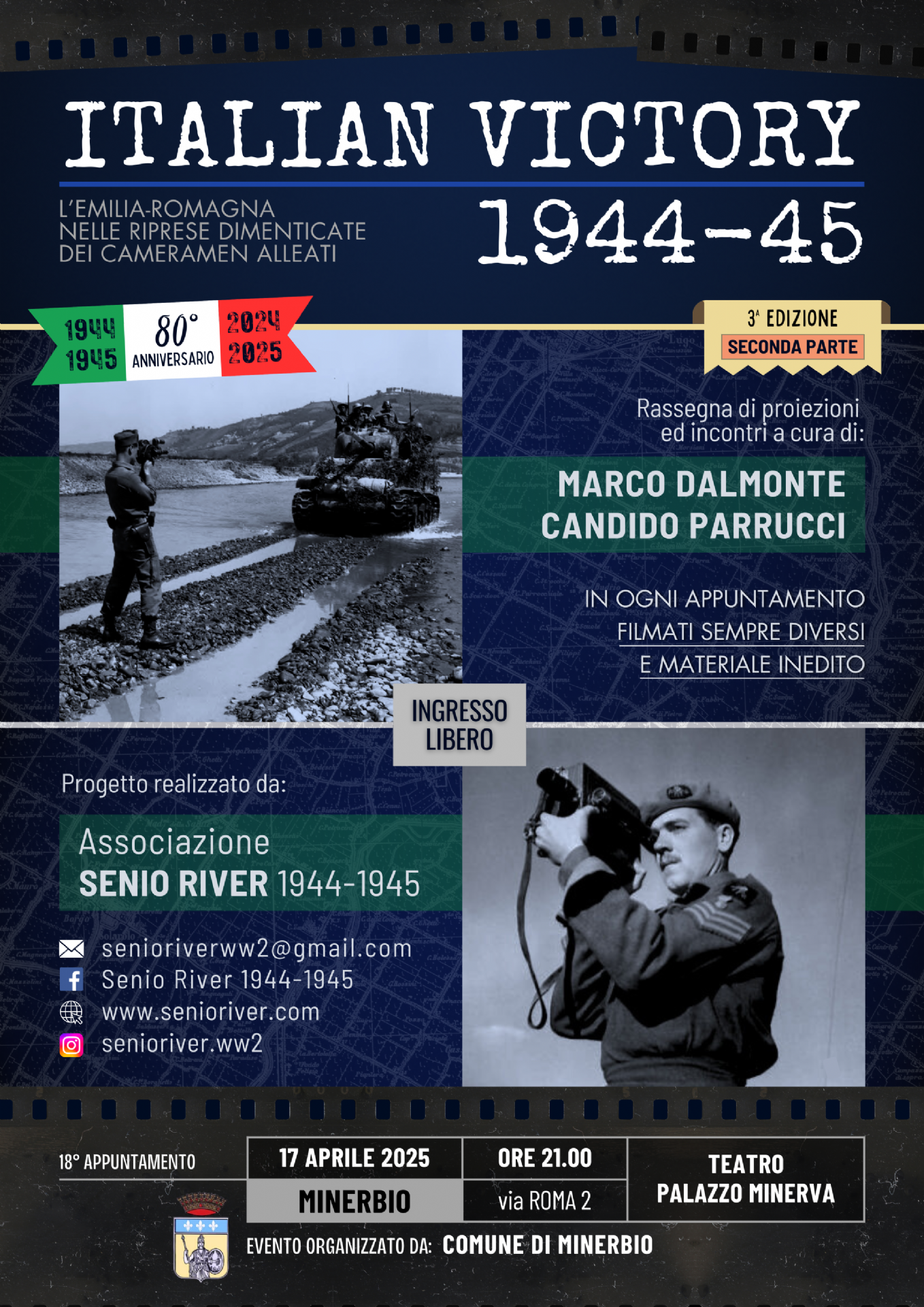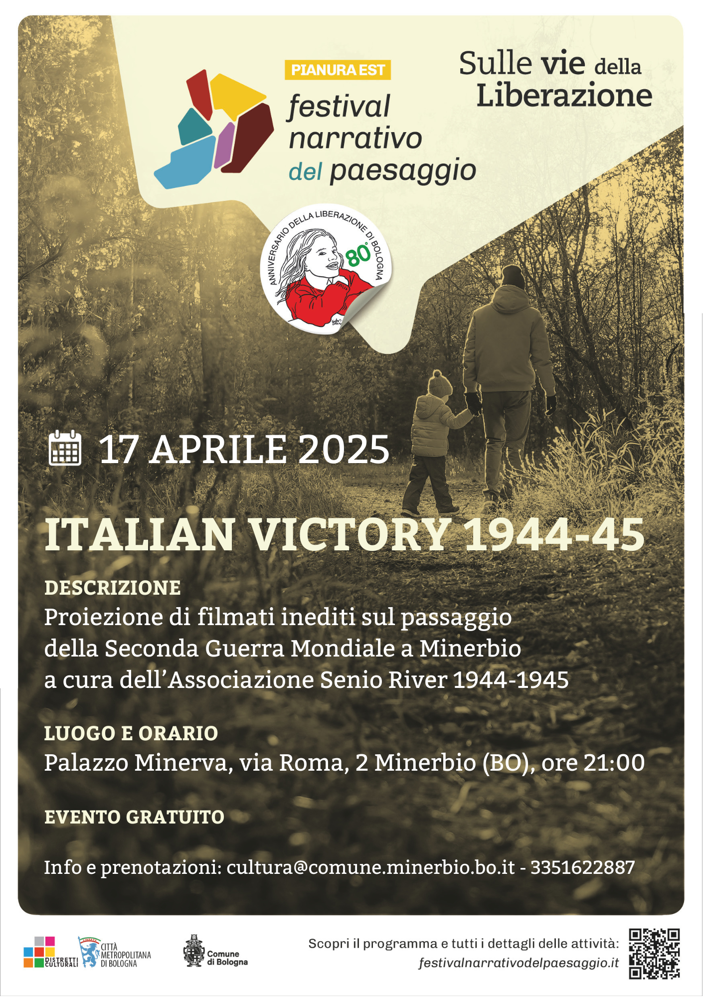 Giovedì 17 aprile 2025 alle ore 21:00 a Palazzo Minerva, via Roma, 2 all'interno del Festival Narrativo del Paesaggio 2025 "Sulle vie della Liberazione", il Comune di Minerbio organizza con la collaborazione dell'Associazione Senio River 1944-1945, l'evento "Italian Victory 1944-1945", una serie di proiezioni inerenti il passaggio della Seconda Guerra Mondiale sul territorio tramite video girati dai cineoperatori alleati durante la Liberazione.