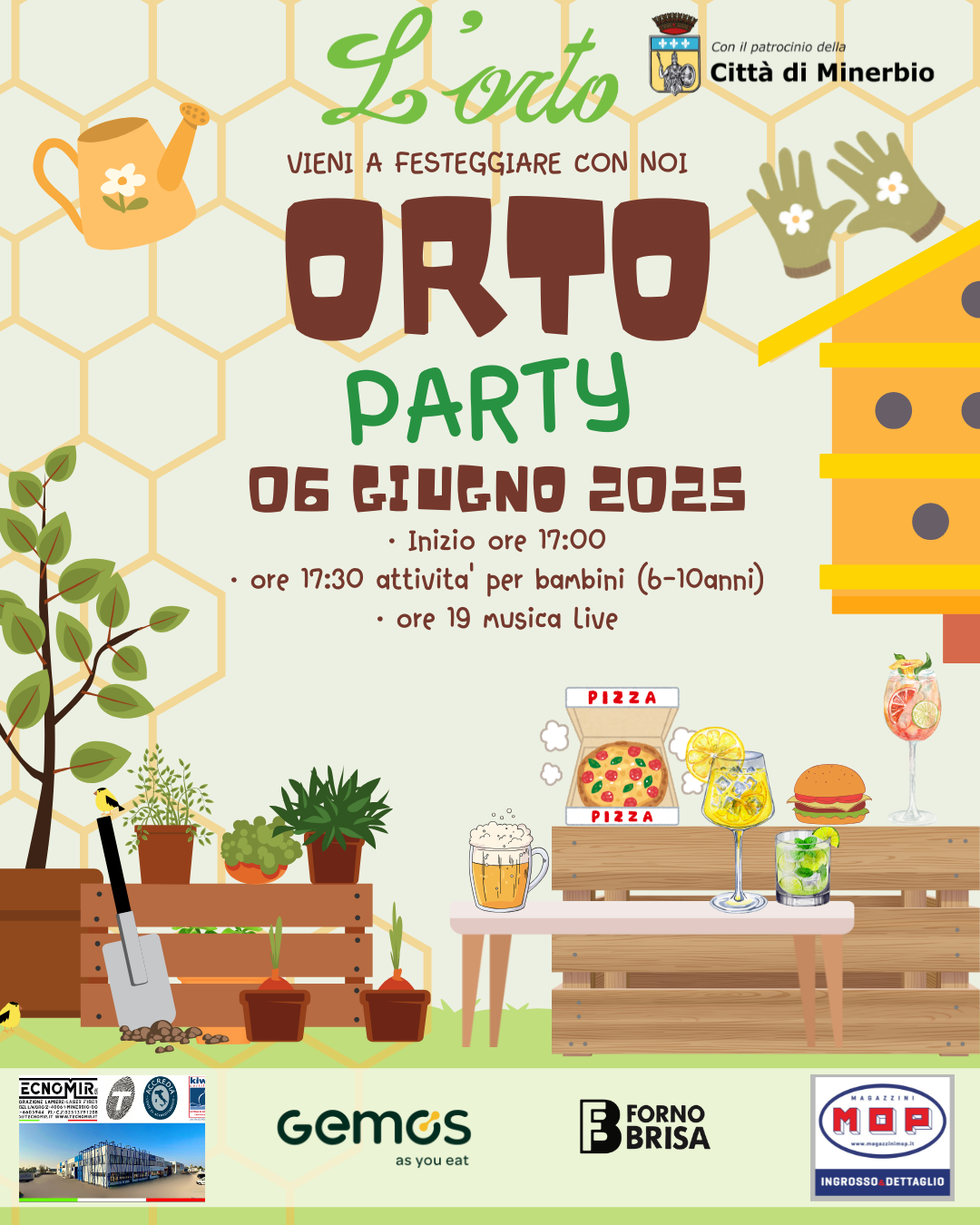 Venerdì 6 giugno 2025, alle ore 17:00 si terrà l'evento "L'orto party" in via G. Marconi 2/B a Minerbio - con il patrocinio del Comune di Minerbio.