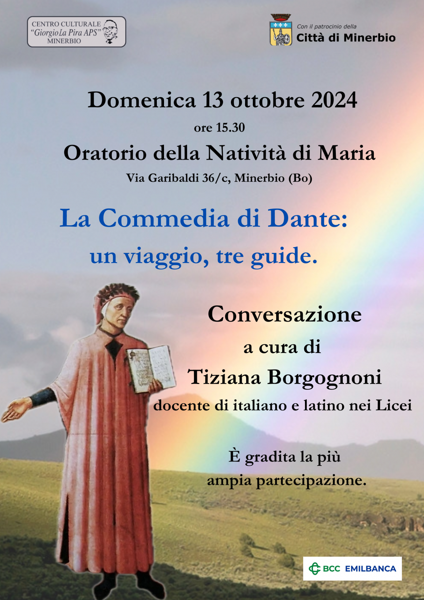 Domenica 13 ottobre 2024 alle ore 15.30 nell'Oratorio della Natività di Maria di Minerbio si terrà la conferenza a cura della professoressa Tiziana Borgognoni dal titolo: La Commedia di Dante: un viaggio, tre guide, organizzata dal Centro Culturale G. La Pira, con il Patrocinio del Comune di Minerbio.