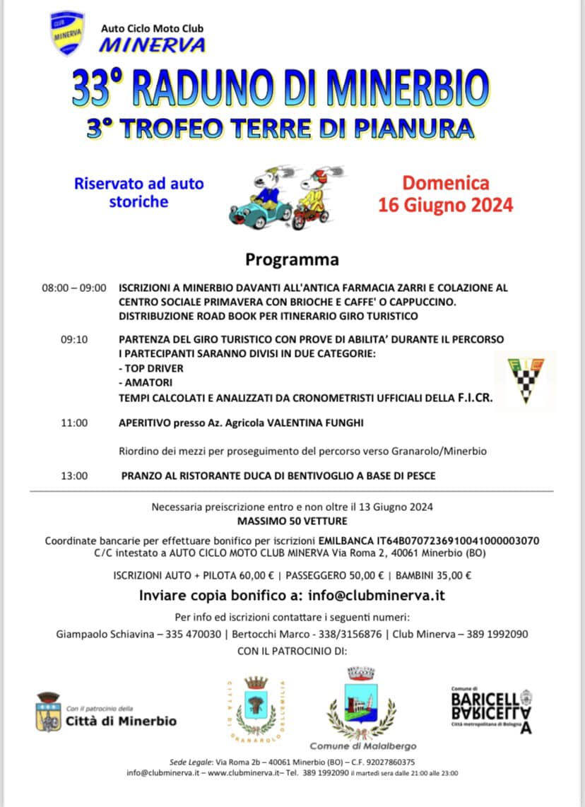 Domenica 16 giugno 2024 in occasione della 24a Dolce Fiera, l'Auto Ciclo Moto Club Minerva organizza il 3° Trofeo Terre di Pianura e il 33° Raduno di Minerbio riservato ad auto storiche.