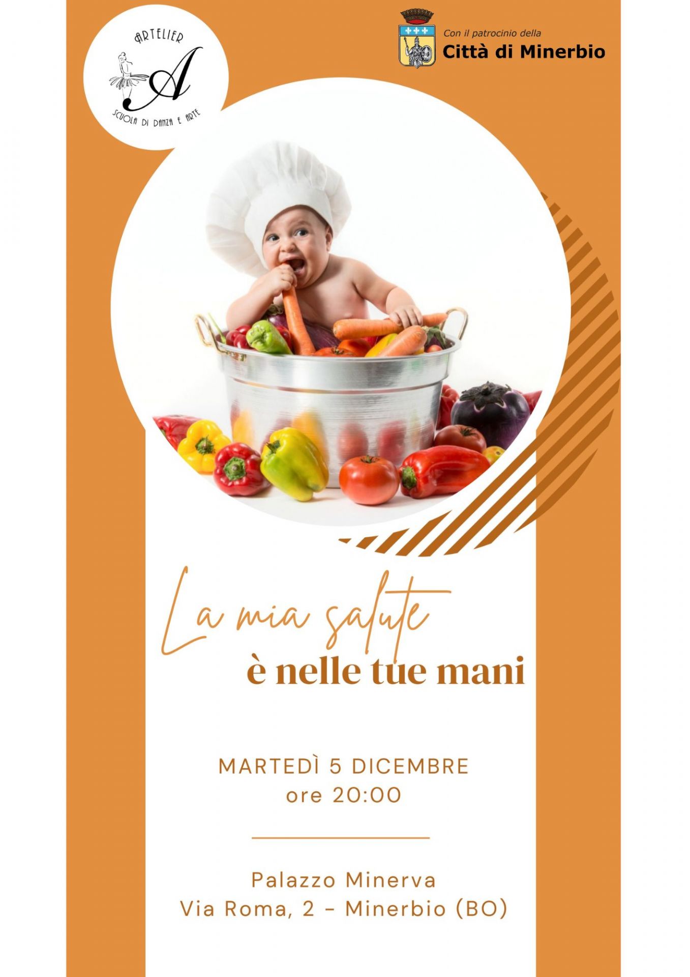 Martedì 5 dicembre 2023 presso il teatro Palazzo Minerva (via Roma, 2 Minerbio) alle ore 20.00 Asd Artelier, con il patrocinio del Comune di Minerbio, organizza un incontro intitolato "La mia salute è nelle tue mani" tenuto dalla Dott.ssa Greta Aristidi, nutrizionista, personal trainer e educatrice alimentare.