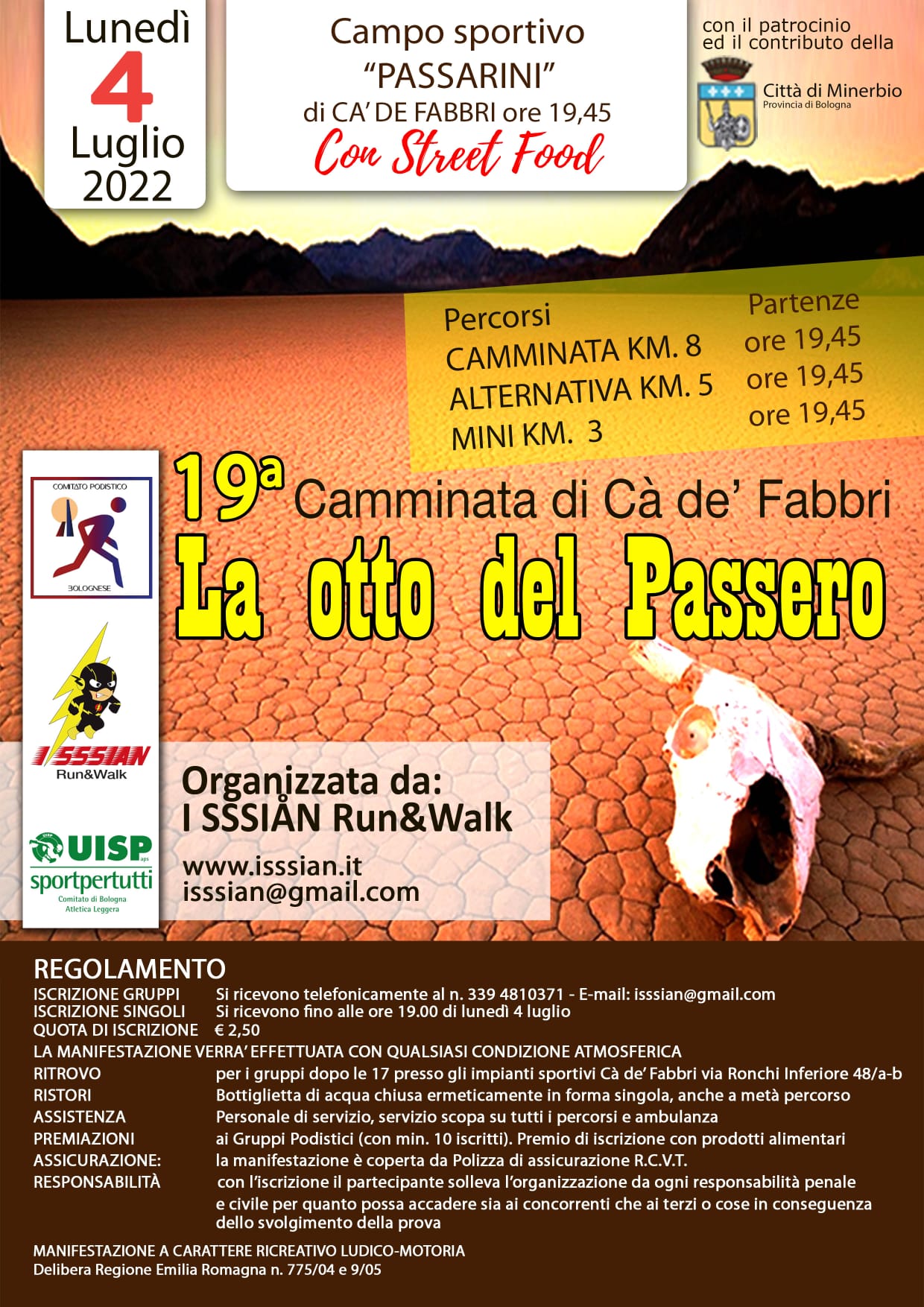 Lunedì 4 luglio dalle ore 19:45, torna l'evento sportivo dell'estate, la camminata "otto del Passero" giunta alla sua 19esima edizione. La partenza sarà a Cà de Fabbri da via Ronchi Inferiore, 48/a-b, presso il Centro Sportivo Passarini.