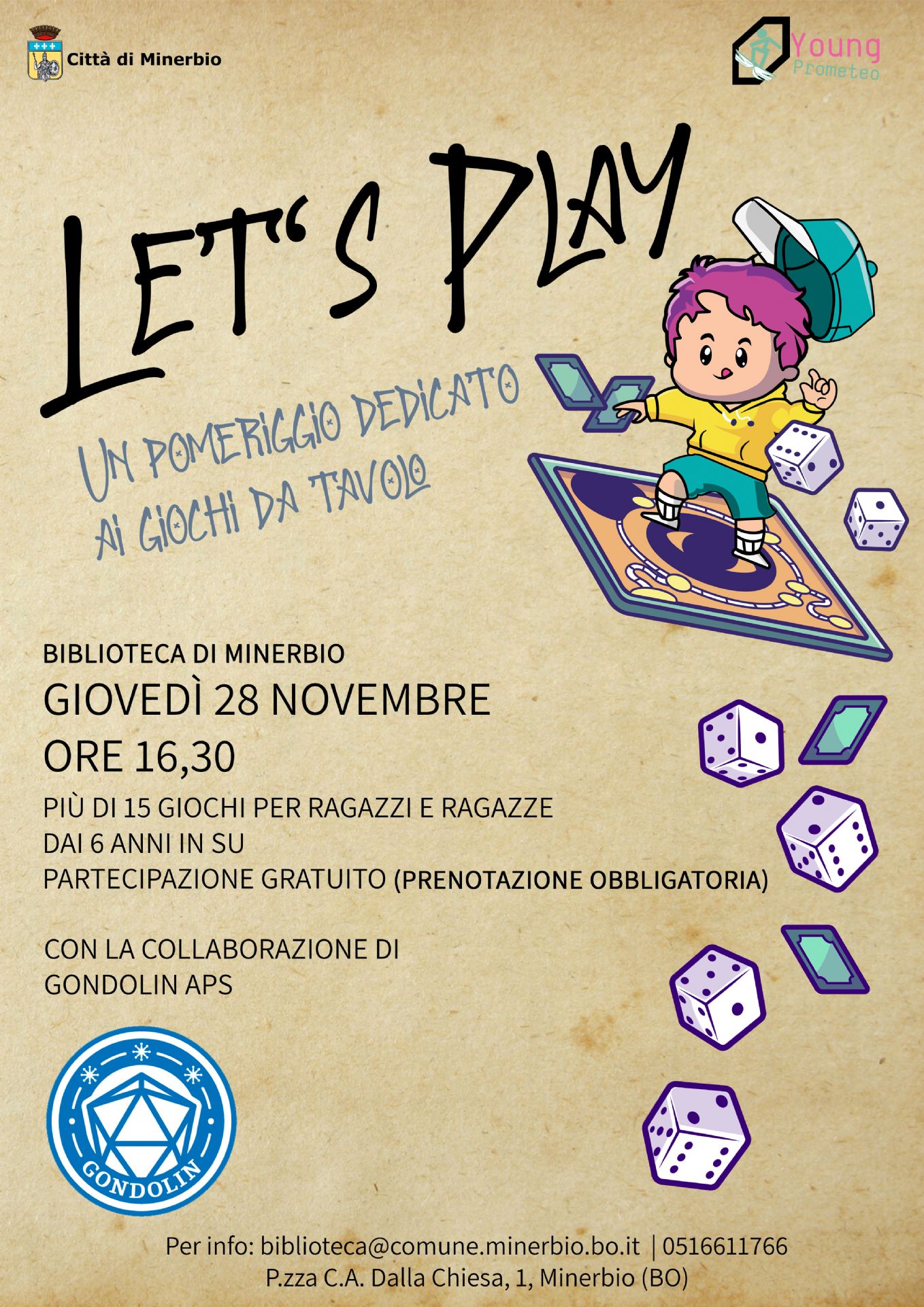 Giovedì 28 novembre 2024 alle ore 16,30 presso la Biblioteca Comunale Prometeo di Minerbio, si terrà l'iniziativa "Let's Play!", un pomeriggio dedicato ai giochi da tavolo per, bambine e bambini, ragazze e ragazzi dai 6 anni in su, con più di 15 giochi diversi.