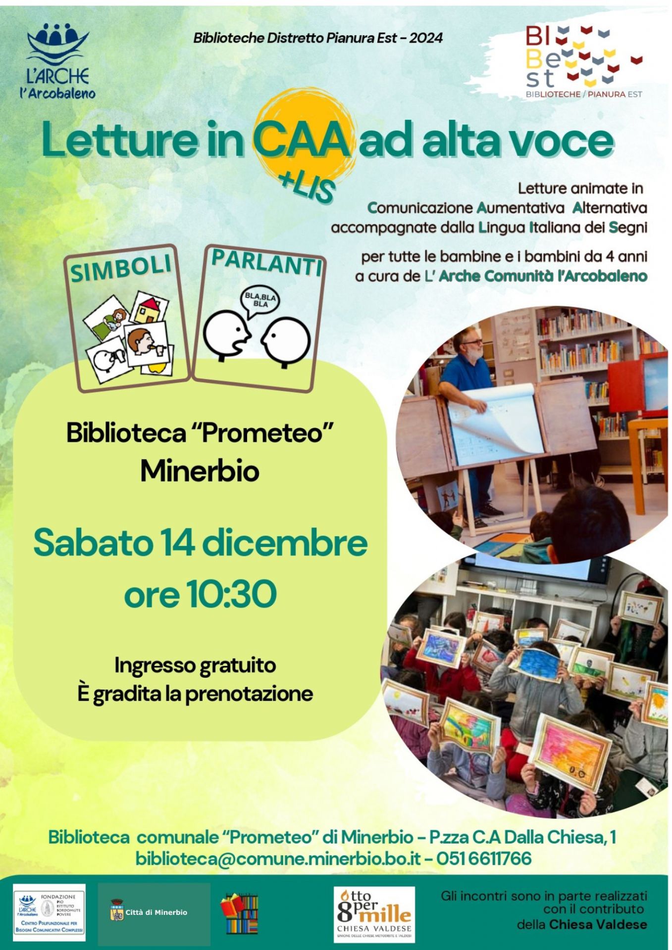Sabato 14 dicembre 2024 alle ore 10.30 presso la Biblioteca Comunale Prometeo di Minerbio ci saranno letture animate in Comunicazione Aumentativa Alternativa accompagnate dalla Lingua Italiana dei Segni, per tutte le bambine e i bambini dai 4 anni, a cura di l'Arche Comunità l'Arcobaleno.