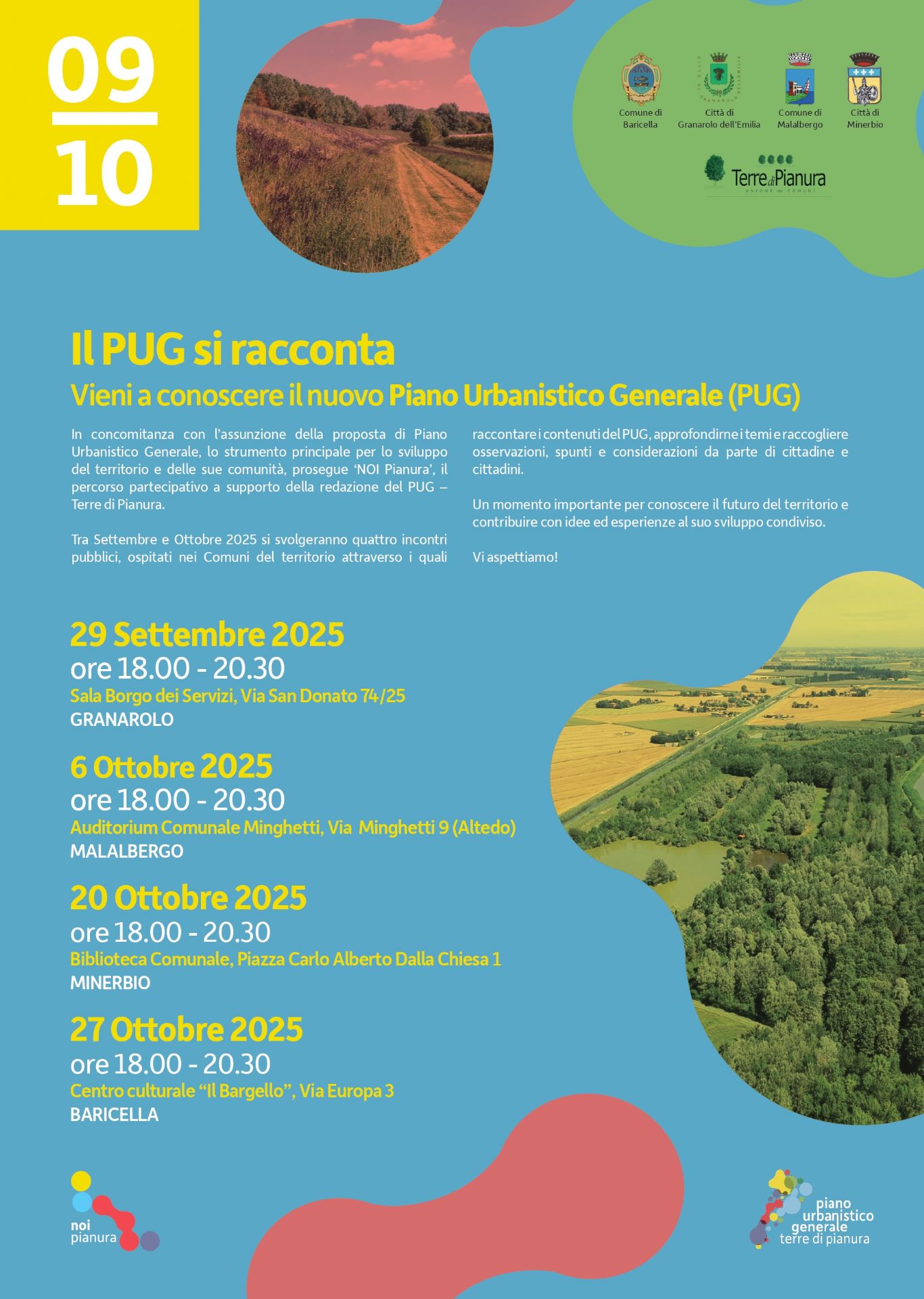 Tra settembre e ottobre 2025 sono in programma quattro incontri pubblici, ospitati nei Comuni dell’Unione, attraverso i quali raccontare i contenuti del PUG, approfondirne i temi e raccogliere osservazioni, spunti e considerazioni da parte di chi vive e lavora quotidianamente..